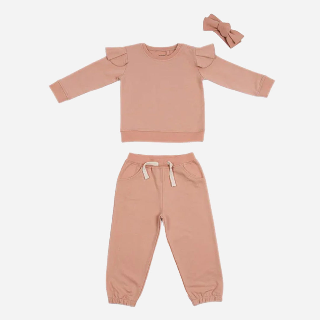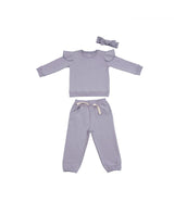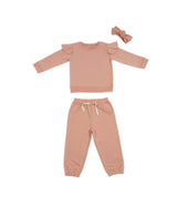 Jogger suit with snap buttons at shoulders and pomegranate ruffle detail