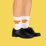 These fun socks are for the person who loves wearing captioned clothing. Comedy socks can be worn with shoes, boots and sandals. These unique socks make a great gift for any occasion.