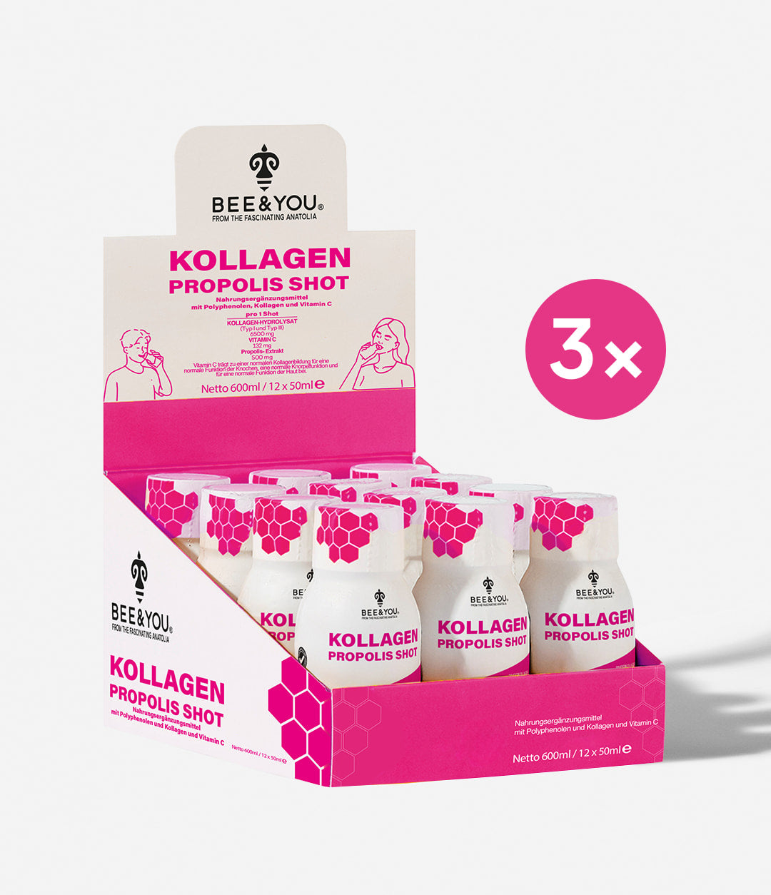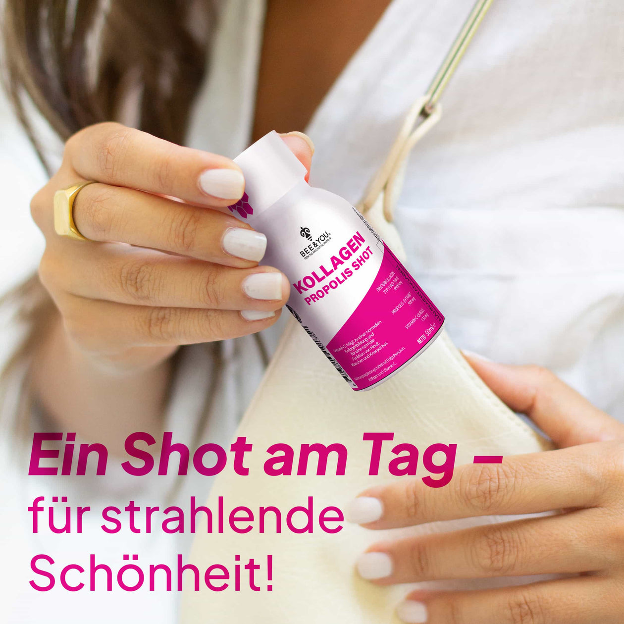Kollagen Shot mit Propolis und Vitamin C. Das beste Kollagen zum trinken mit Kollagen-Hydrolysat (Typ I und Typ III) enthält zusätzlich Vitamin C. Vitamin C trägt zu einer normalen Kollagenbildung und für eine normale Funktion von Haut, Knochen und Knorpel bei.