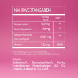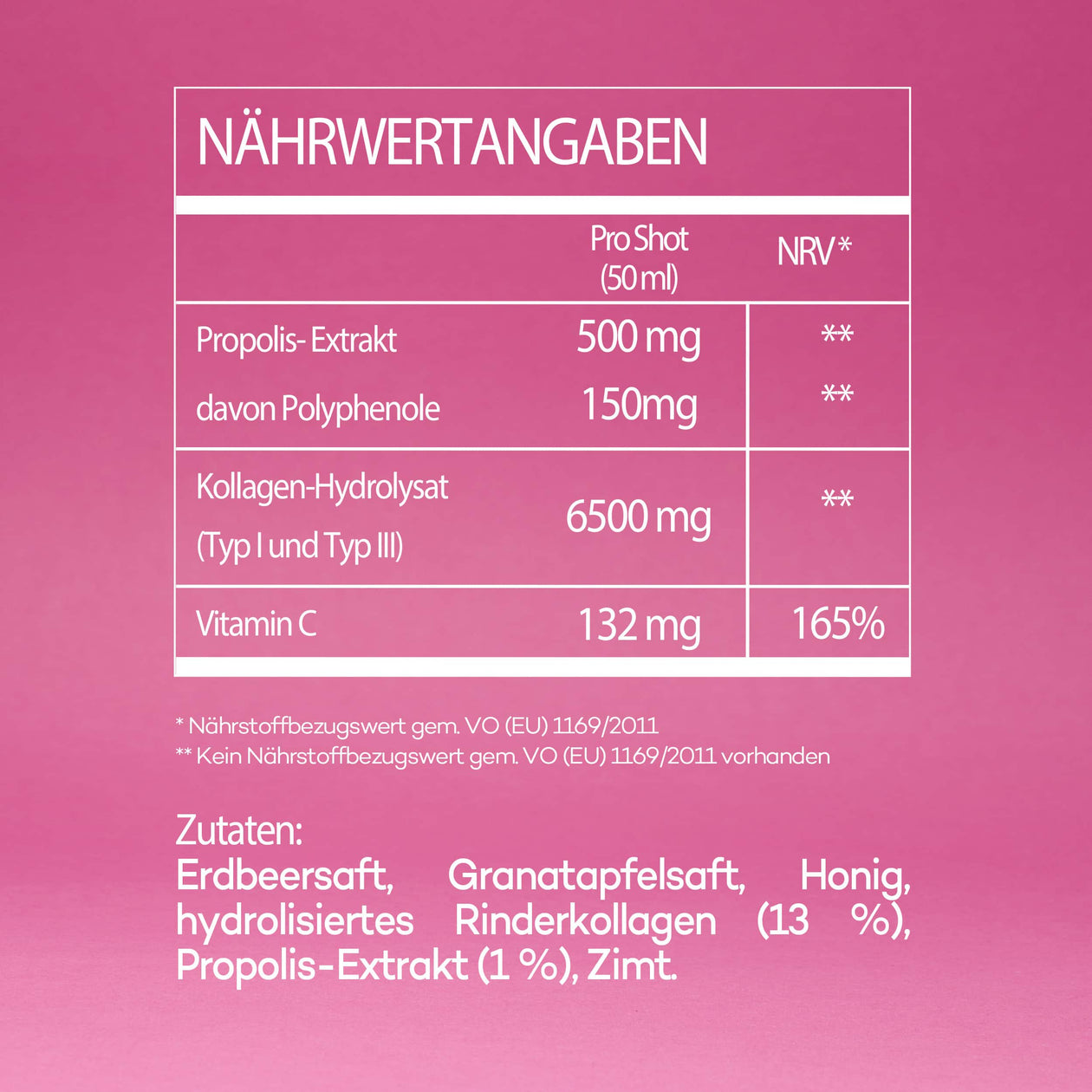 Inhalt: Erdbeersaft, Granatapfelsaft, Honig, hydrolisiertes Rinderkollagen (13%), Propolis Extrakt (1%), Zimt