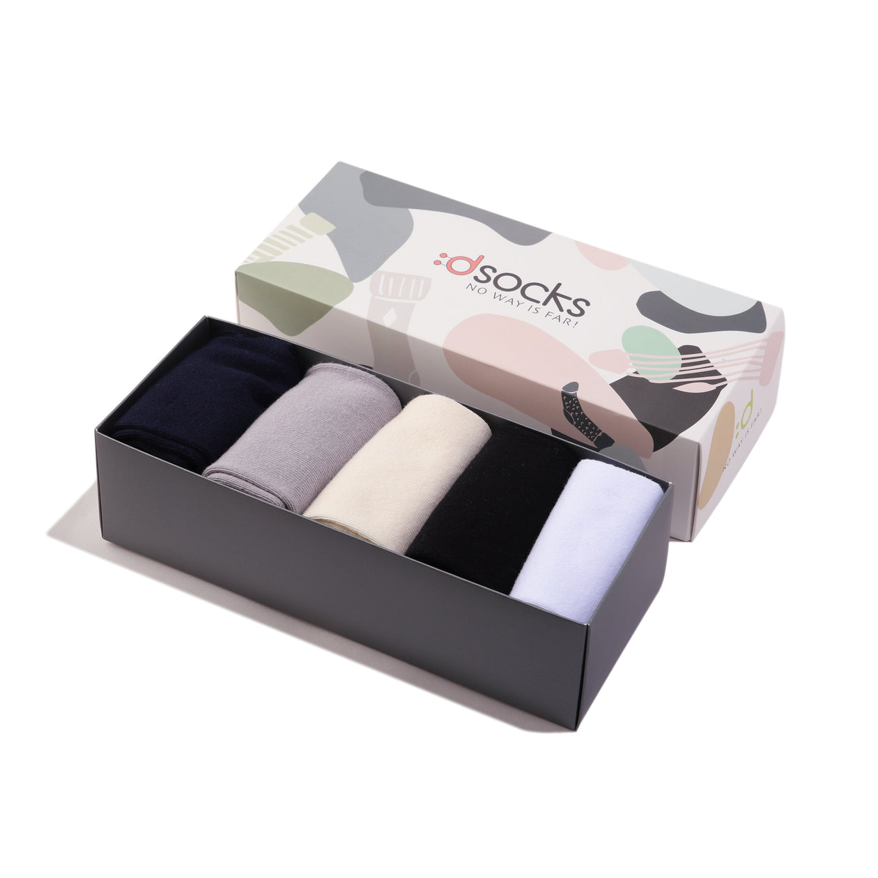 Gift box comes with 5 pairs of socks in white, beige, grey, dark blue and black