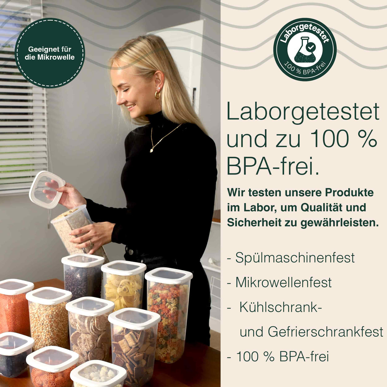 - 🔬 KEIN VERZICHT AUF QUALITÄT : Vorratsdosen-Sets aus bestem Material, unzerbrechlich, BPA-frei, geeignet für Lebensmittelkontakt & Mikrowellen- und Tiefkühlgebrauch. Bureau Veritas-Labortests bestätigen die Funktionalität der Vorratsdosen mit Deckel