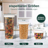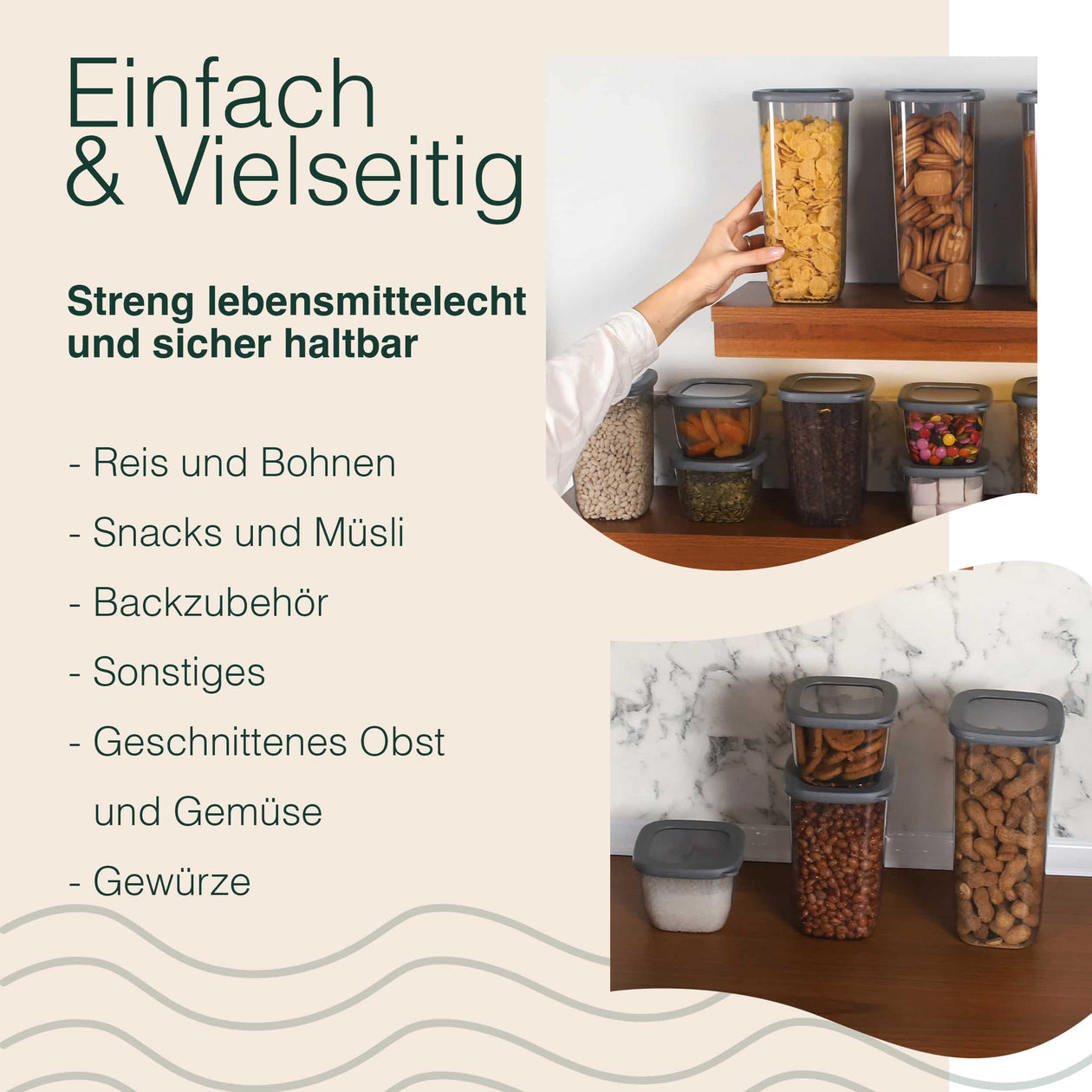 - 🌿 LUFTDICHTE DECKEL : Silikondichtungen der Aufbewahrungsboxen, die das Eindringen von Luft und Feuchtigkeit verhindern, halten Lebensmittel länger frisch und sind ideal für die Aufbewahrung von Reis, Nudeln, Müsli und Mehl