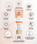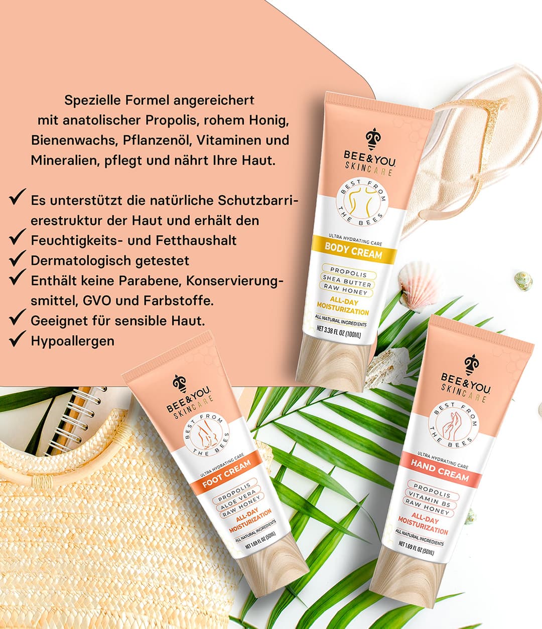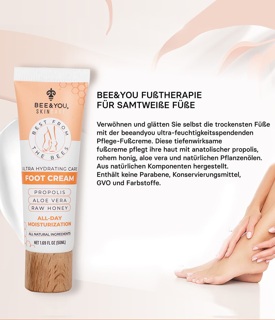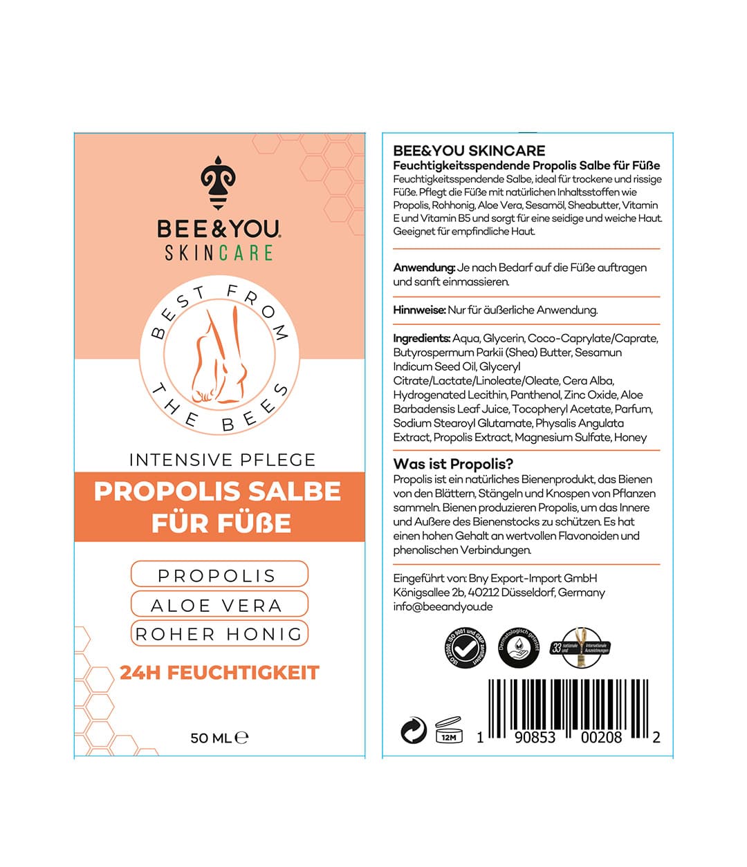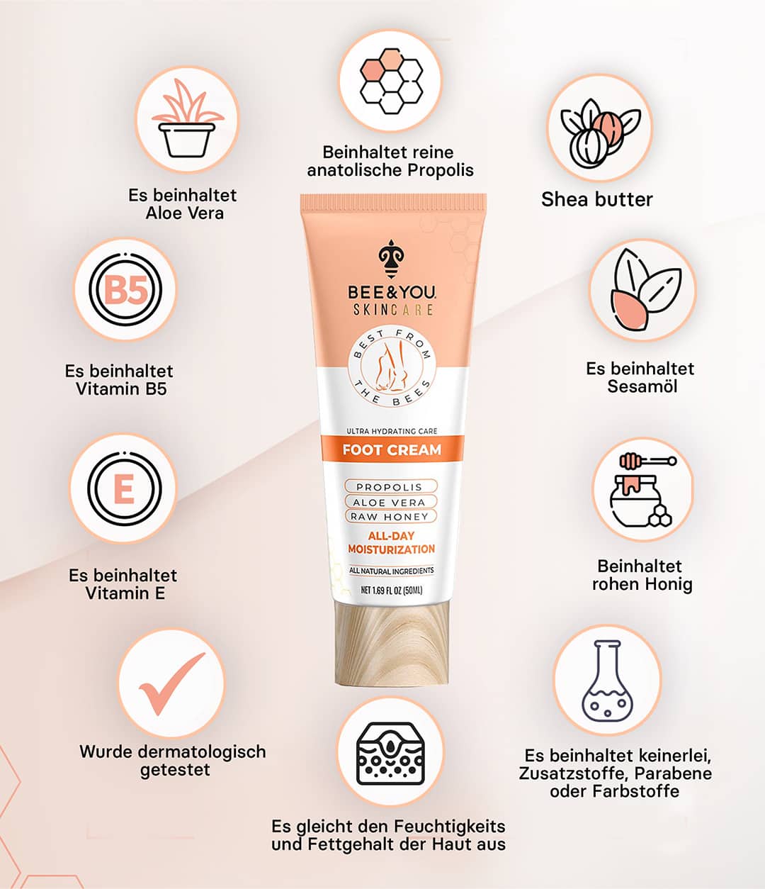 BEE&YOUs patentiertes reines anatolisches Propolis, Roher Honig, Aloe Vera, natürliche Pflanzenöle und Vitamine beruhigen trockene und strapazierte Fußhaut, spenden intensive Feuchtigkeit und Pflege.