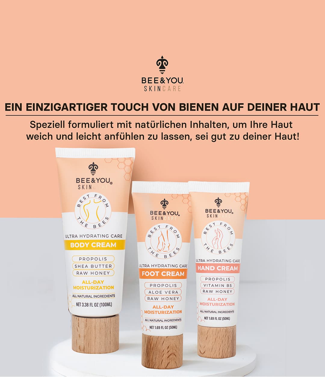 Der völlig natürliche und saubere Inhalt der BEE&YOU APICARE Körper-, Hand- und Fußcremes wurde von Experten des BEE&YOU Propolis Forschungs- und Entwicklungszentrums entwickelt.