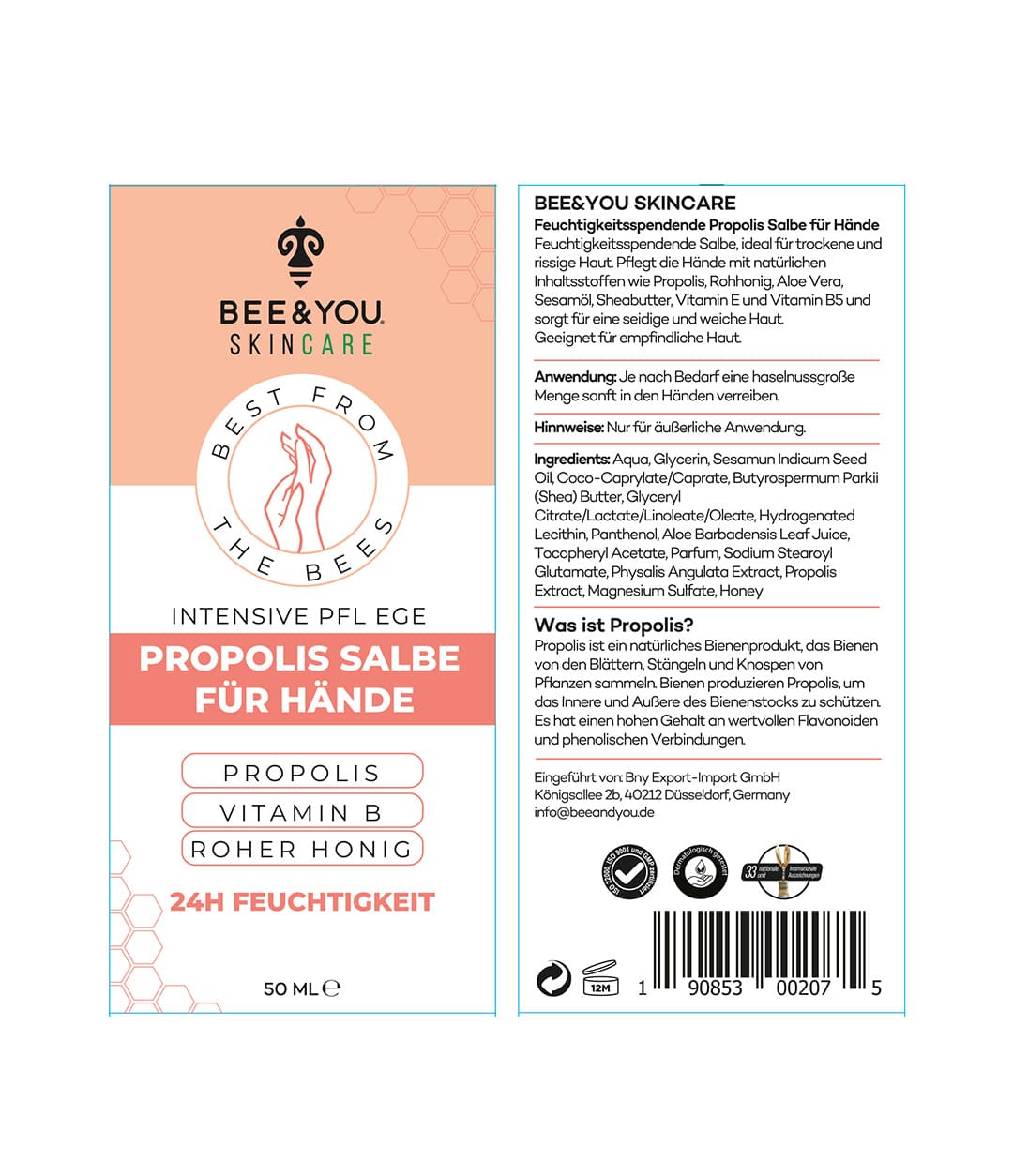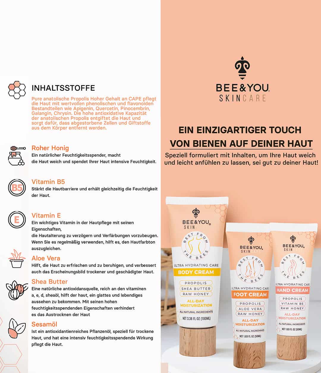 Während BEE&YOUs patentiertes reines anatolisches Propolis mit seinem Gehalt an Vitamin B5 und E intensive Feuchtigkeit spendet, nährt es Ihre Hände und Nägel mit rohem Honig und natürlichen Pflanzenölen und gibt ihnen die nötige Pflege.