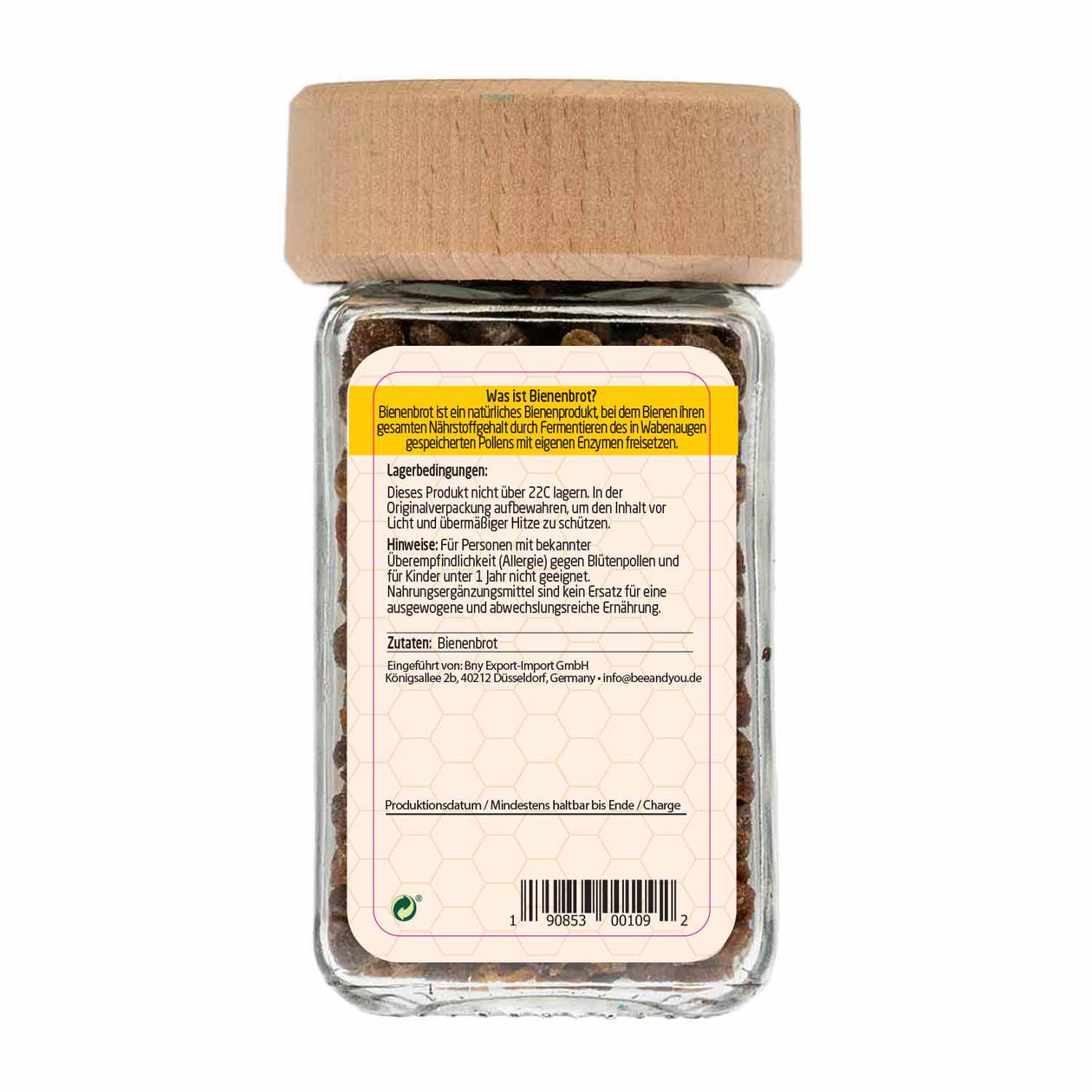 Die Zusammensetzung von Bienenbrot; Eiweiß, Kohlenhydrate, Ballaststoffe und Fette sowie Vitamine (Niacin (B3), Pyridoxin (B6), Thiamin (B1), Riboflavin (B2), Pantothensäure (B5), Folsäure, Biotin (H)), Tocopherol (E ), Ascorbinsäure (C), Beta-Carotin) Mineralstoffe (Kalium (K), Calcium (Ca), Magnesium (Mg), Zink (Zn), Eisen (Fe), Kupfer (Cu), Mangan (Mn), Phosphor (P), phenolische Substanzen, Flavonoide, Polyphenole, Aminosäuren, Fettsäuren und organische Säuren, es gibt viele biologisch aktive Substanzen.