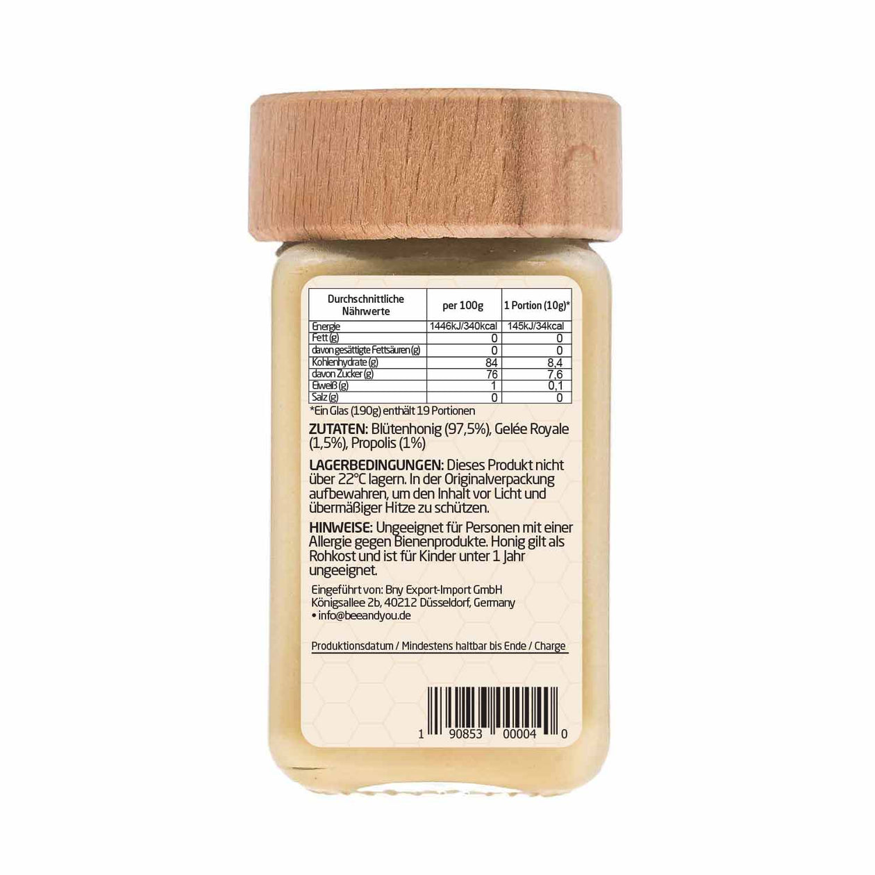 Inhalt: Honig (97,5%), Gelée Royale (1,5%),Propolis Extrakt (1%)
