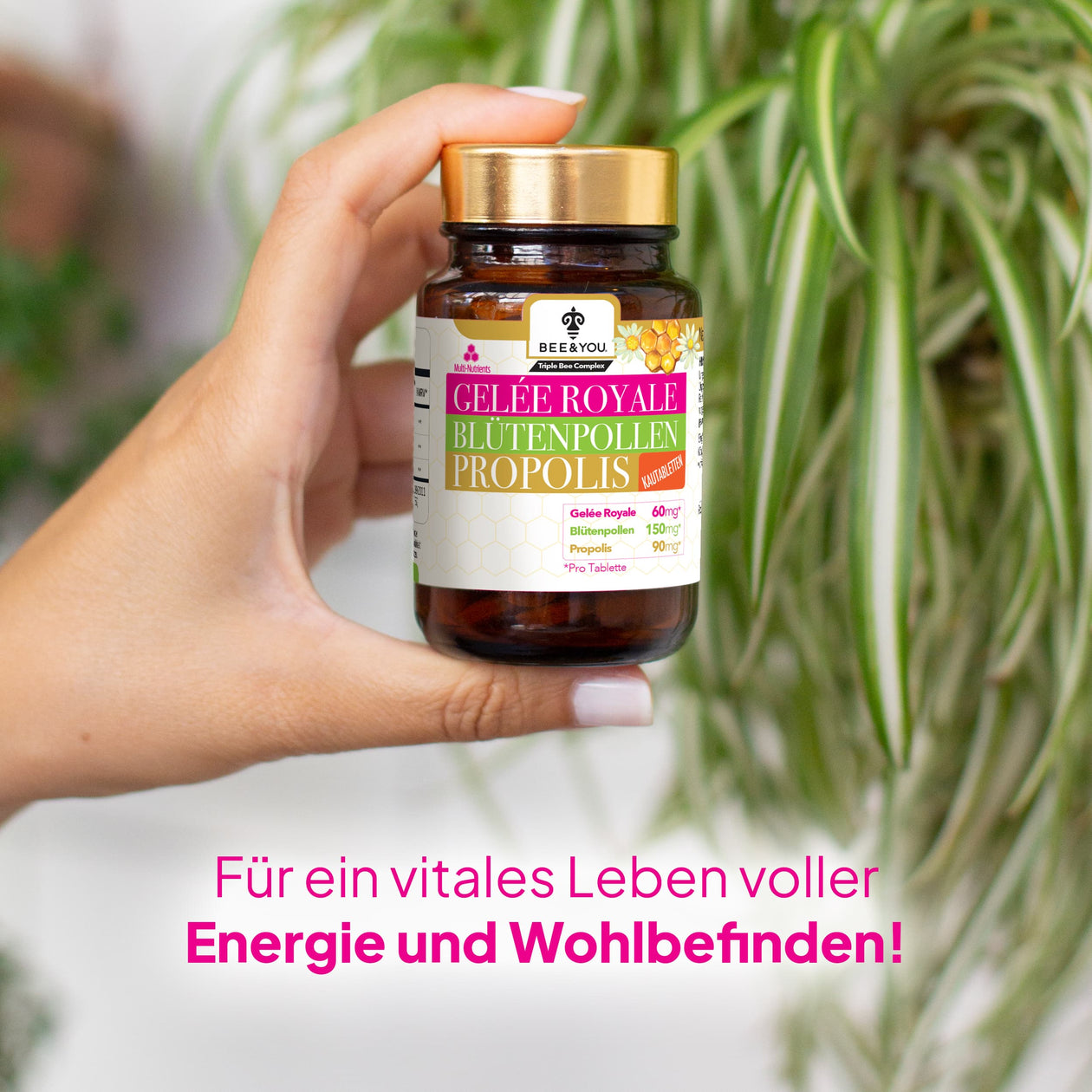 Unsere Gelee Royale, Blütenpollen und Propolis Kautabletten sind eine nährstoffreiche 3-in-1-Ergänzung. Diese Kautabletten bieten die kombinierten Vorteile von Gelee Royale, Blütenpollen und Propolis in einer praktischen kaubaren Form. Gelee Royale ist reich an Vitaminen und Proteinen, Blütenpollen liefern eine Vielzahl von Nährstoffen und Propolis ist bekannt für seine antioxidativen Eigenschaften. Genießen Sie die Vielseitigkeit dieser Kautablette als eine einfache Möglichkeit, wichtige Nährstoffe zu erhalten und Ihr Wohlbefinden zu unterstützen. Kinder lieben Kautabletten aufgrund ihres angenehmen Geschmacks mit Kakao und Johannsibrot, was die tägliche Nahrungsergänzung zu einer Freude macht.