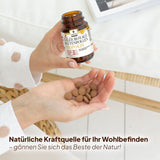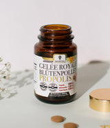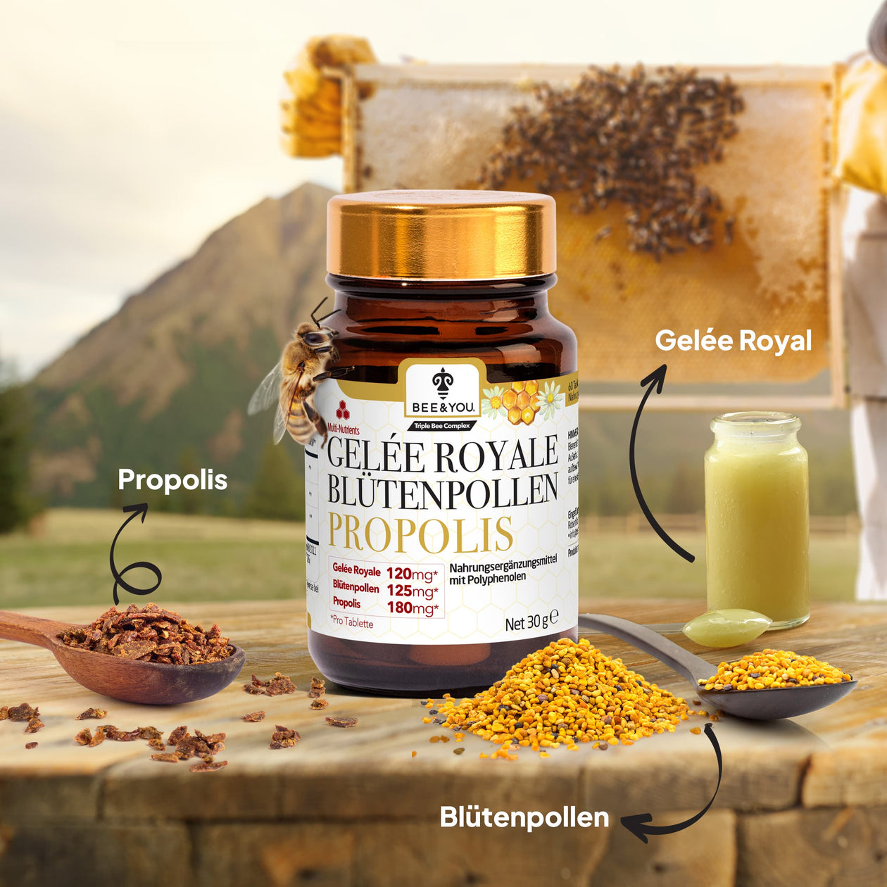 Unsere Gelee Royale, Blütenpollen und Propolis Tabletten sind eine nährstoffreiche 3-in-1-Ergänzung.Diese Tabletten bieten die kombinierten Vorteile von Gelee Royale, Blütenpollen und Propolis in einer praktischen Form. Gelee Royale ist reich an Vitaminen und Proteinen, Blütenpollen liefern eine Vielzahl von Nährstoffen und Propolis ist bekannt für seine antioxidativen Eigenschaften. Genießen Sie die Vielseitigkeit dieser Tabletten als eine einfache Möglichkeit, wichtige Nährstoffe zu erhalten und Ihr Wohlbefinden zu unterstützen