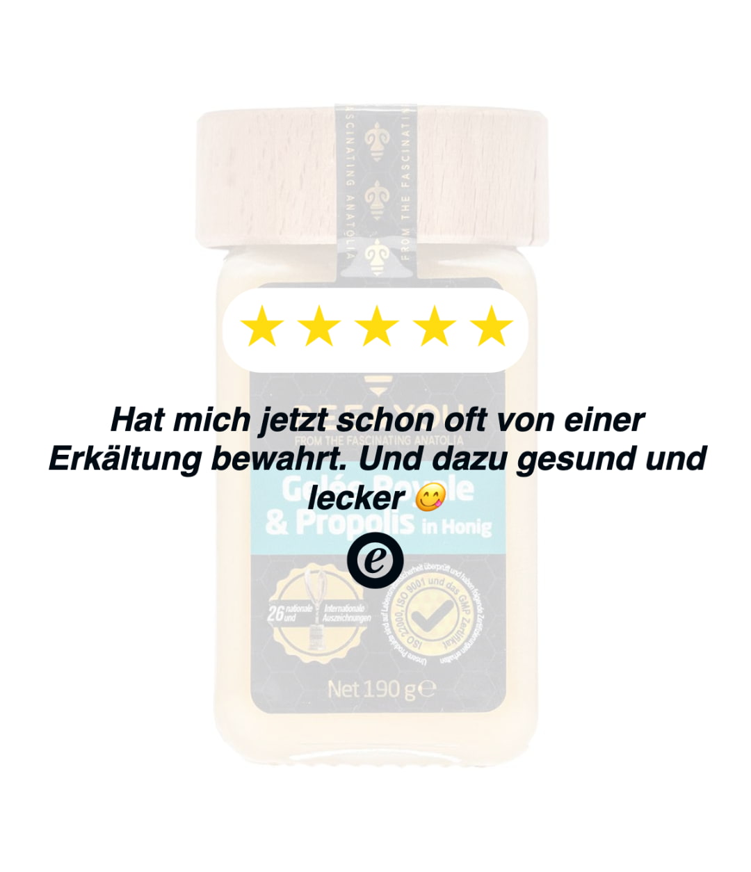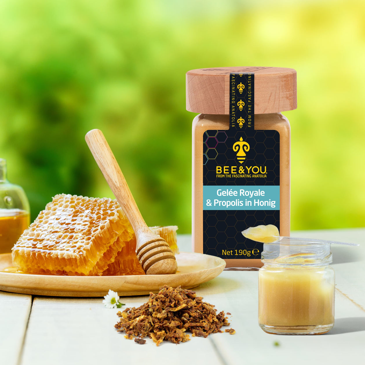Honig mit Gelée Royale und Propolis ist eine exklusive Fusion von Bienenprodukten. Gelée Royale, der Futtersaft der Bienenkönigin, ist bekannt für seine hohe Konzentration an Vitaminen und Proteinen, während Propolis als Antioxidans mit wertvollen Polyphenolen und Flavonoiden gilt. In dieser einzigartigen Kombination vereinen sich diese natürlichen Inhaltsstoffe mit dem süßen Geschmack von Honig, um nicht nur eine delikate Gaumenfreude zu bieten, sondern auch eine nährstoffreiche Unterstützung zu gewährleisten. Diese harmonische Verbindung von Honig, Gelée Royale und Propolis ist ein wahrer Schatz der Natur für Ihr Wohlbefinden.