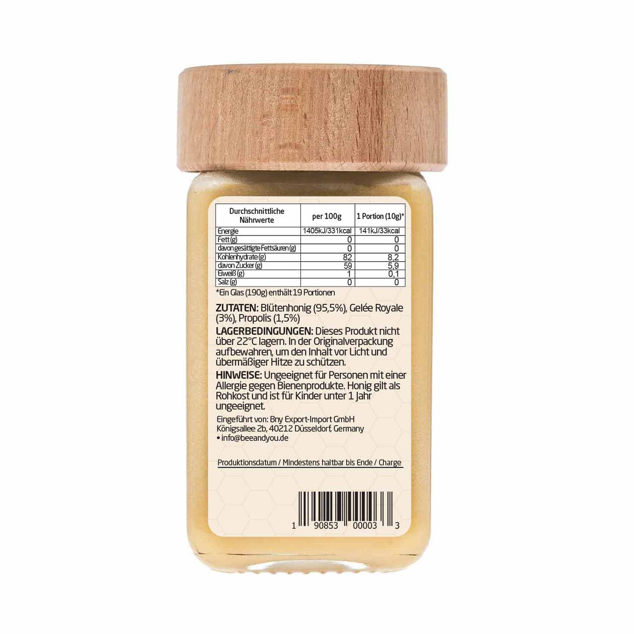 Inhalt: Honig (95,5%), Gelée Royale (3%),Propolis Extrakt (1,5%)