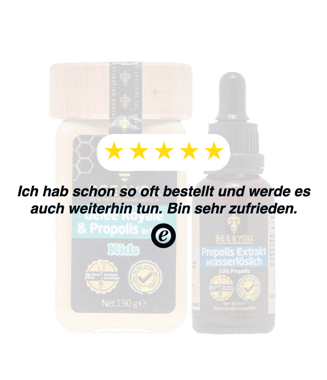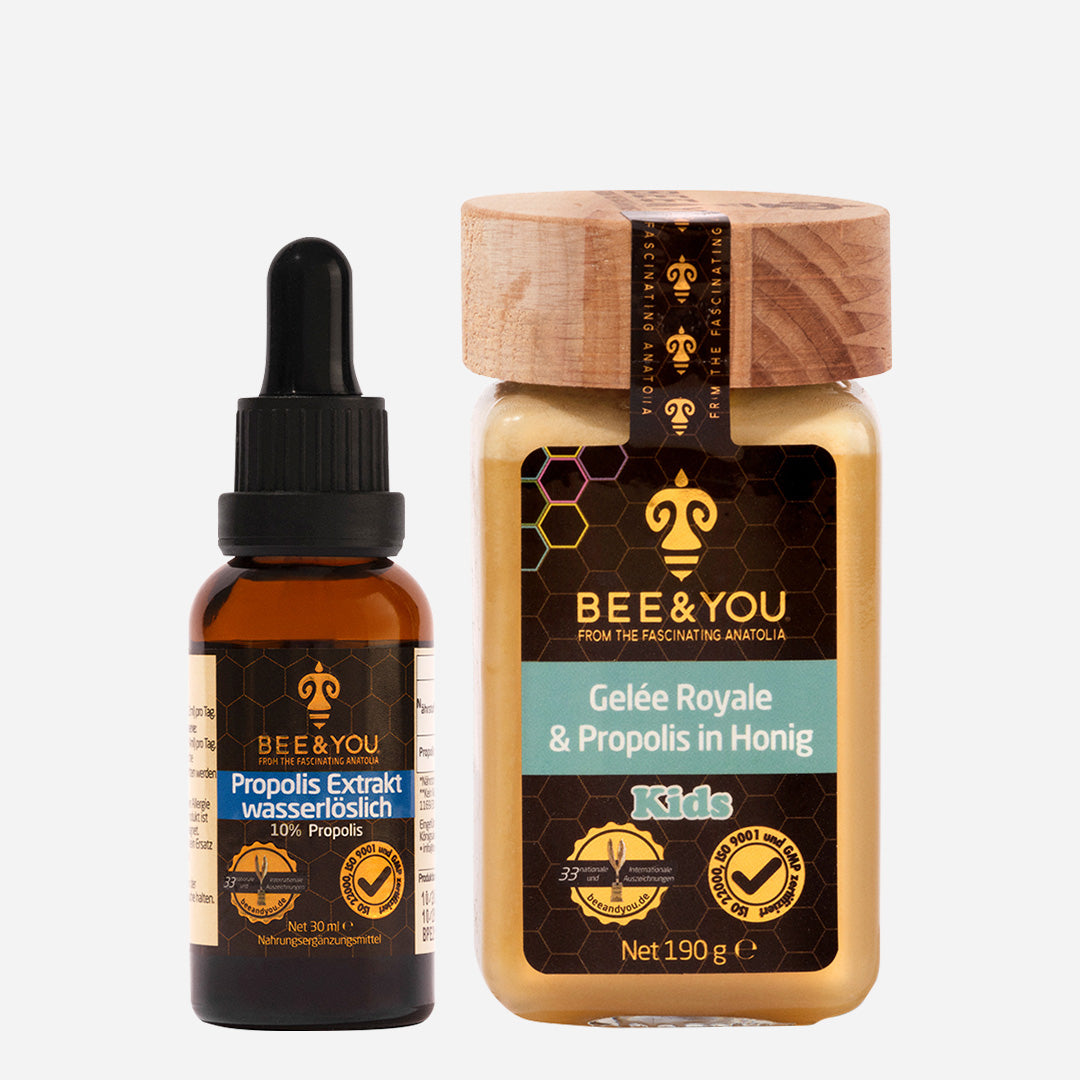 Das BEE&YOU Kennenlern-Paket ist das vorteilhafteste Paket, das für Sie vorbereitet wurde, um Bienenprodukte kennenzulernen. Es enthält 100% natürliche und reine Bienenprodukte. Das Bee & You Kennenlern-Paket enthält Propolis Wasserlöslich 10% & Gelée Royale für Kinder. Es ist die köstlichste Art, Propolis und andere Bienenprodukte kennenzulernen.