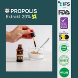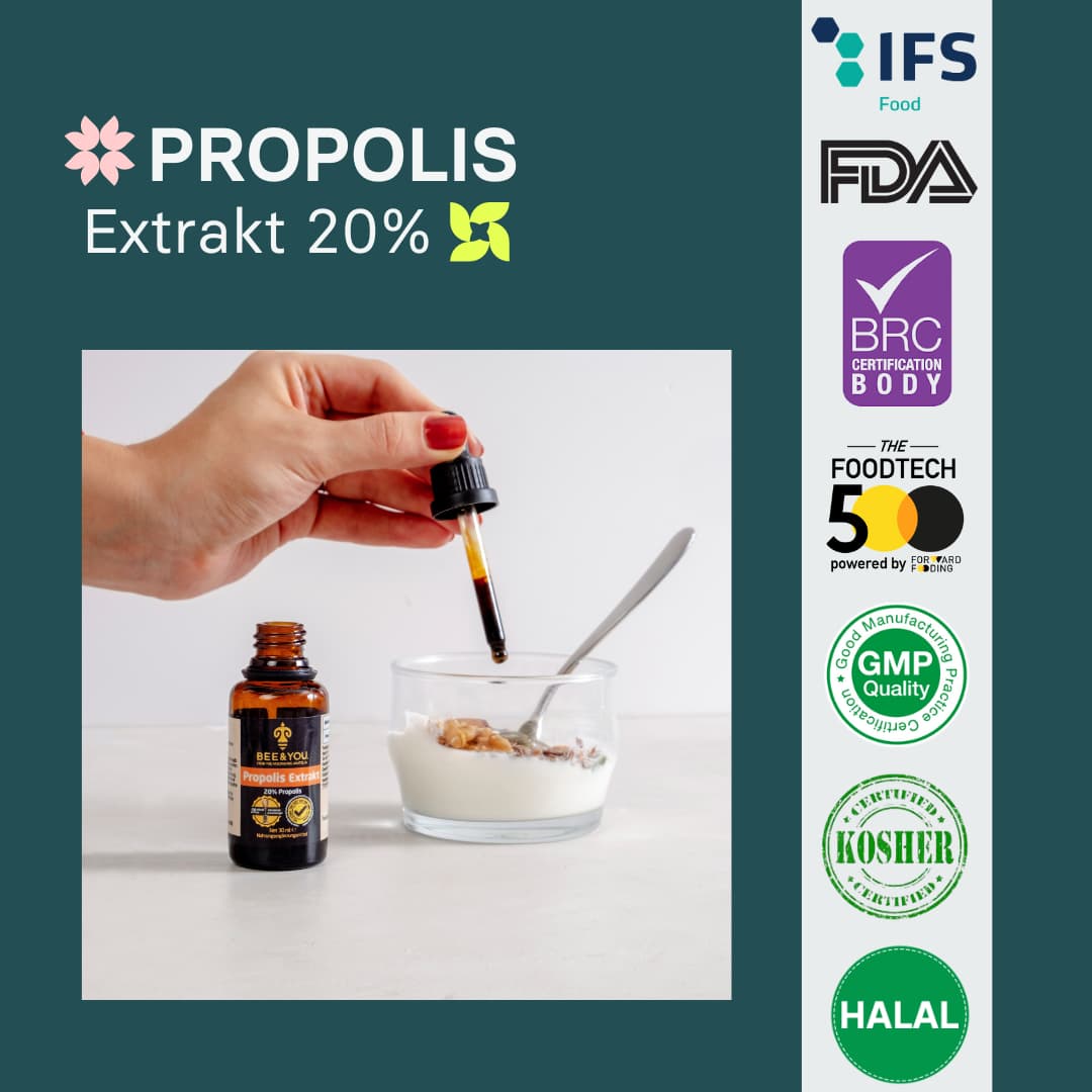 Dank unserer innovativen Extraktionsmethode bleiben die wertvollen Komponenten von Propolis maximal erhalten. Wir verfügen über internationale Zertifikate wie GMP, BRC, IFS, ISO9000, ISO22000, Halal und Kosher, die die Sicherheit und Qualität unserer Produkte belegen.