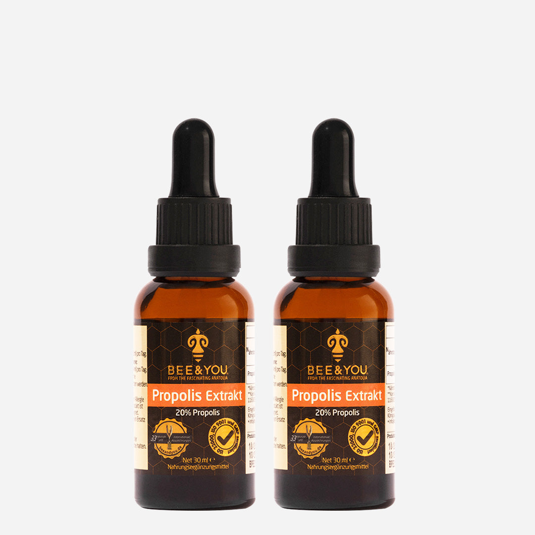 Rohes Propolis ist ein natürliches Bienenprodukt, das aus phenolischen und Flavonoide Substanzen besteht, die von Bienen aus den Blättern, Stängeln und Knospen von Pflanzen gesammelt werden. Als Wortbedeutung ist reines Propolis, bestehend aus den Wörtern Pro (Vor) + Polis (Beschützer), wie auch schon der Name verrät, der Vorreiniger und für den Schutz der Lebensraum von Bienen verantwortlich. Bienen bedecken ihre Wabenaugen mit rohem Propolis und fügen dann ihren Honig, Jungtiere und Nahrung hinzu. So werden die von den Bienen produzierten Produkte ohne Verderb im Bienenstock gelagert. Nachdem es aus dem Bienenstock entnommen wurde, muss es für den menschlichen Verzehr angepasst und verarbeitet werden, damit der Körper dieses Produkt verdauen kann. An dieser Stelle ist das wichtigste Thema die richtige Verarbeitung von rohem anatolischem Propolis, das ein wertvolles Lebensmittel ist. Die Qualität und Nährwertgehalt kann nur durch korrekter Extraktionsverfahren erhalten bleiben. Durch das preisgekrönte Verarbeitungsverfahren der BEE&YOU Experten werden die im rohen anatolischen Propolis enthaltenen Polyphenole, Terpenoide, Aminosäuren, flüchtigen organischen Säuren, Ketone, Cumarine, Chinone, Vitamine und Mineralstoffe in wasserlöslicher Form konserviert.