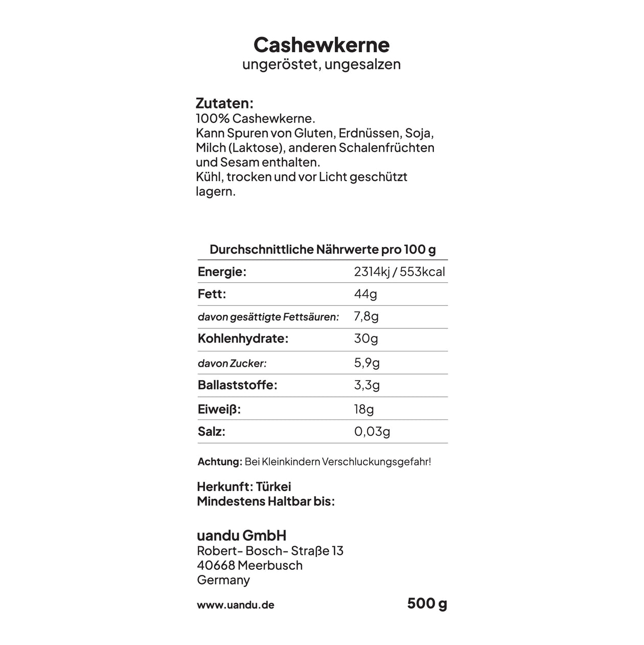 Beschreibung: Unsere naturbelassenen Cashewkerne sind ein gesunder und köstlicher Snack. Diese Nüsse werden sorgfältig ausgewählt und schonend geröstet, um ihren vollen Geschmack zu bewahren. Sie sind reich an Nährstoffen wie Proteinen, gesunden Fetten und Ballaststoffen und enthalten keine künstlichen Zusätze. Die natürliche Süße und der herzhafte Geschmack machen sie zu einer idealen Option für Zwischenmahlzeiten oder als Zutat in verschiedenen Gerichten. Cashewkerne sind auch eine hervorragende Quelle für wichtige Mineralstoffe wie Magnesium und Kupfer. Unsere naturbelassenen Cashewkerne sind ein gesunder und leckerer Snack für jeden, der die reine Natur schätzt.