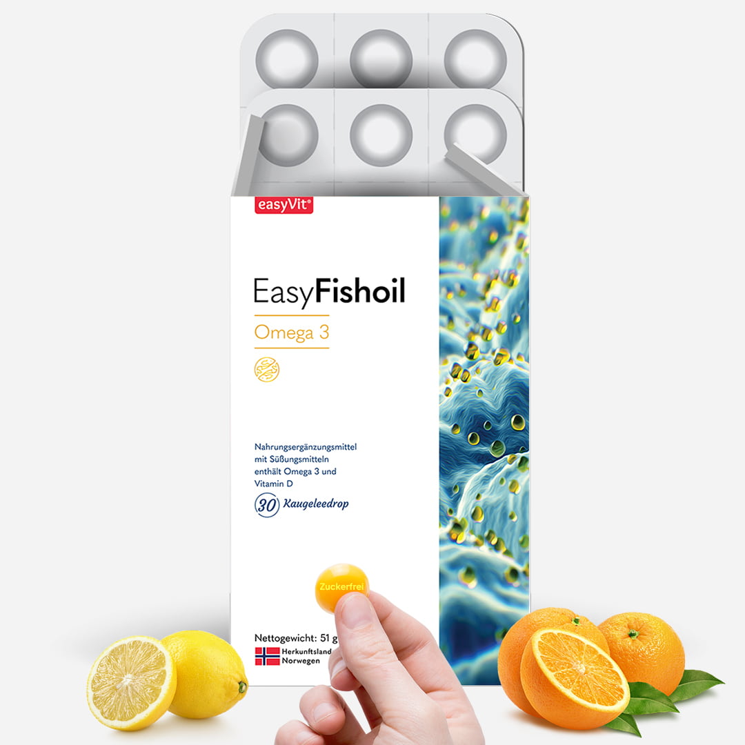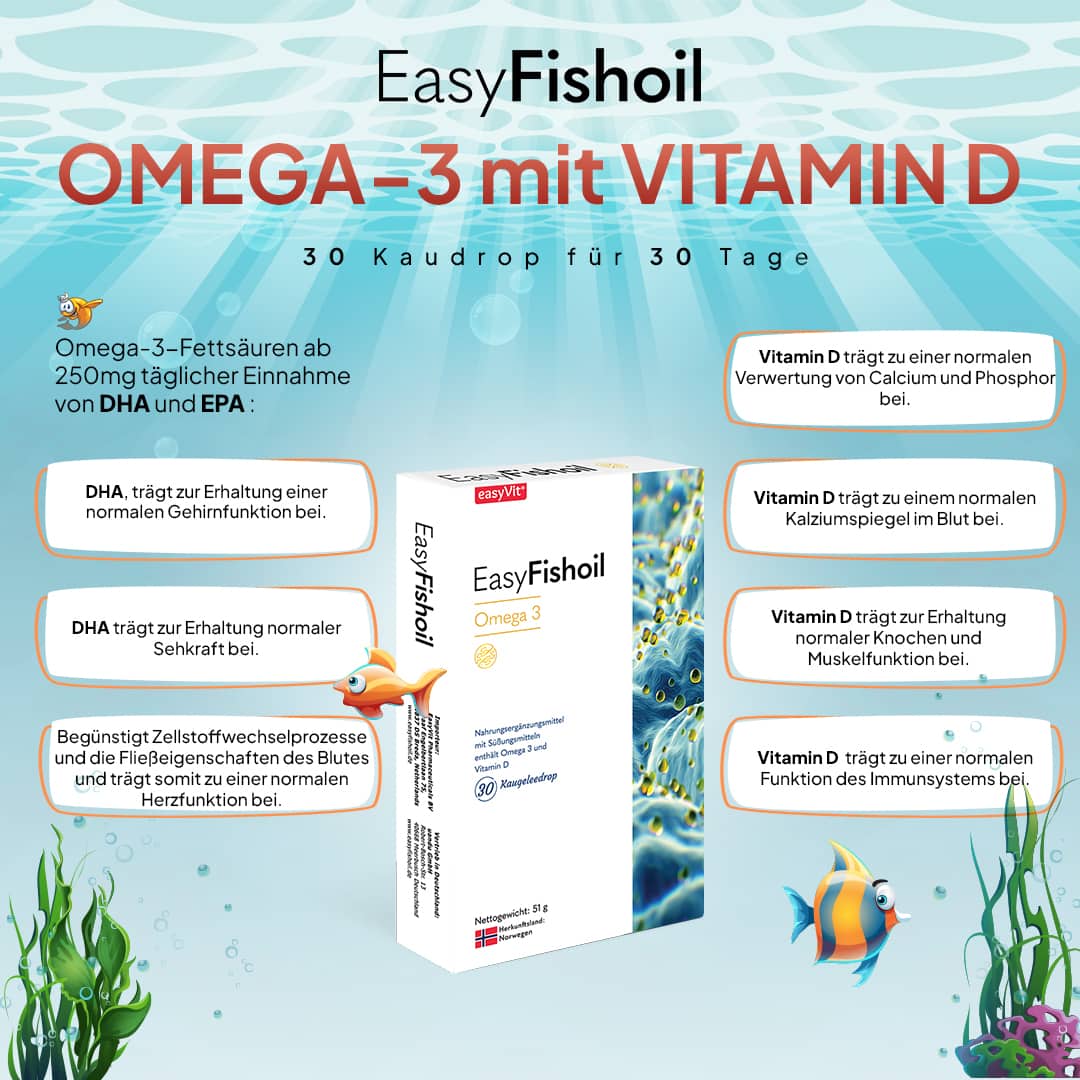 EasyFishoil adult Kaudrops für Erwachsene sind nicht nur lecker, sondern auch vollgepackt mit Omega-3 EPA, DHA und Vitamin D. Diese Nährstoffe sind bekannt dafür, das Immunsystem zu stärken, die Herzgesundheit zu fördern und das allgemeine Wohlbefinden zu unterstützen. Omega-3 EPA und DHA spielen eine wichtige Rolle für die Gesundheit von Herz, Gehirn und Augen, während Vitamin D die Knochengesundheit verbessert und das Immunsystem stärkt. Mit unseren Kaudrops wird die Einnahme dieser wichtigen Nährstoffe zu einem angenehmen und unkomplizierten Erlebnis.
