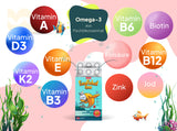 Zutaten:Fischölkonzentrat , Süßungsmittel (Xylit), Wasser, Geliermittel (Fischgelatine), Süßungsmittel (Sorbit), Säureregulator (Trinatriumcitrat), natürliches Zitronenaroma, Verdickungsmittel (Gummi arabicum), Säureregulator (Apfelsäure, Nicotinamid), natürliches Erdbeeraroma, Zinkbisglycinat, D-α-Tocopherol, Säureregulator (L-Ascorbinsäure), färbendes Lebensmittel (Paprika Extrakt), Süßungsmittel (Steviolglycoside), Menaquinone- 7, Pyridoxinhydrochlorid, Retinylpalmitat, Cholecalciferol, (6S)-5-Methyltetrahydrofolsäure - Glucosaminsalz, Kaliumiodid, Cyanocobalamin, D-Biotin.