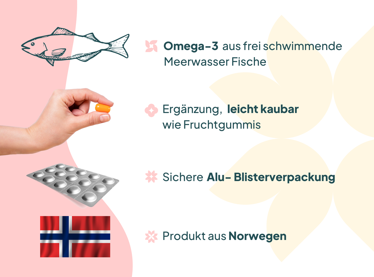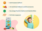 Zutaten: Fischölkonzentrat, Süßungsmittel (Xylit), Wasser, Geliermittel (Fischgelatine), Süßungsmittel (Sorbit), Säureregulator (Trinatriumcitrat), natürliches Zitronenaroma, Verdickungsmittel (Gummi arabicum), Säureregulator (Apfelsäure, Nicotinamid), natürliches Erdbeeraroma, Zinkbisglycinat, D-α-Tocopherol, Säureregulator (L-Ascorbinsäure), färbendes Lebensmittel (Paprika Extrakt), Süßungsmittel (Steviolglycoside), Menaquinone- 7, Pyridoxinhydrochlorid, Retinylpalmitat, Cholecalciferol, (6S)-5-Methyltetrahydrofolsäure - Glucosaminsalz, Kaliumiodid, Cyanocobalamin, D-Biotin.