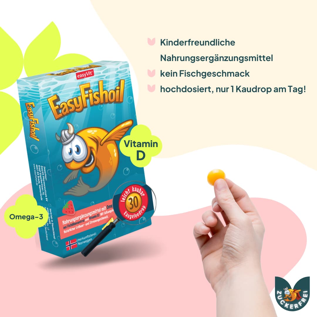 EasyFishoil für Kinder ist eine köstliche Möglichkeit, Omega-3 EPA,DHA und Vitamin D in die Ernährung zu integrieren. Diese leicht zu kauende Gelform unterstützt das gesunde Wachstum und das Immunsystem Ihrer Kinder. Mit ihrem leckeren Geschmack sind sie eine einfache und angenehme Ergänzung für eine gesunde Entwicklung. Machen Sie die tägliche Einnahme zum Genuss für Ihre Kinder mit unseren EasyFishoil Kaudrops.