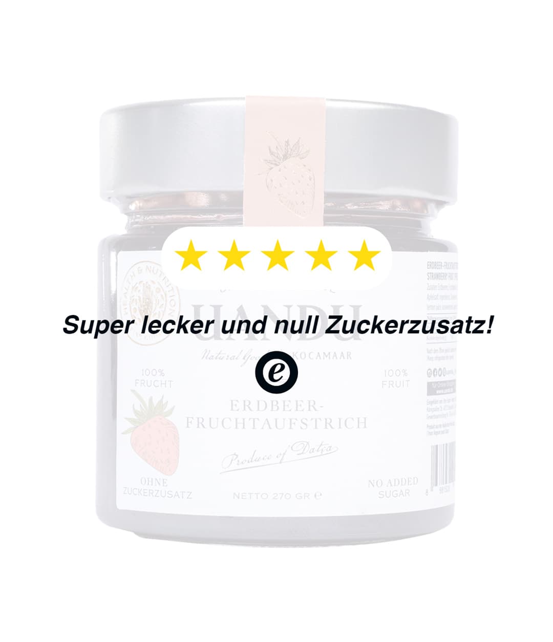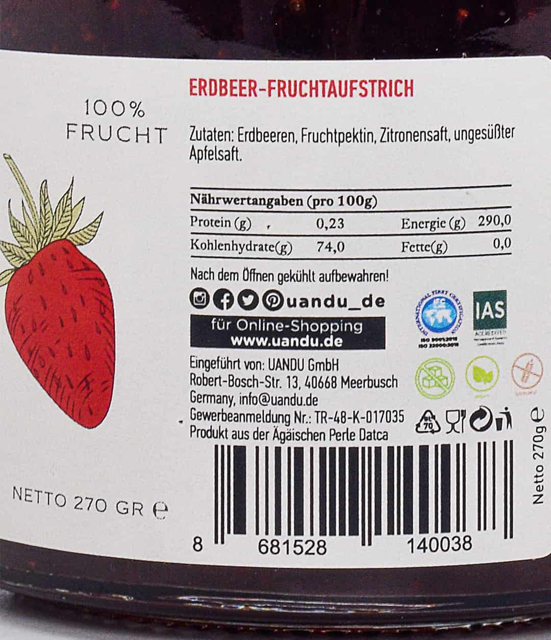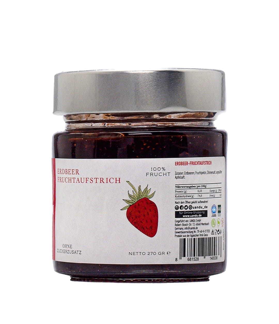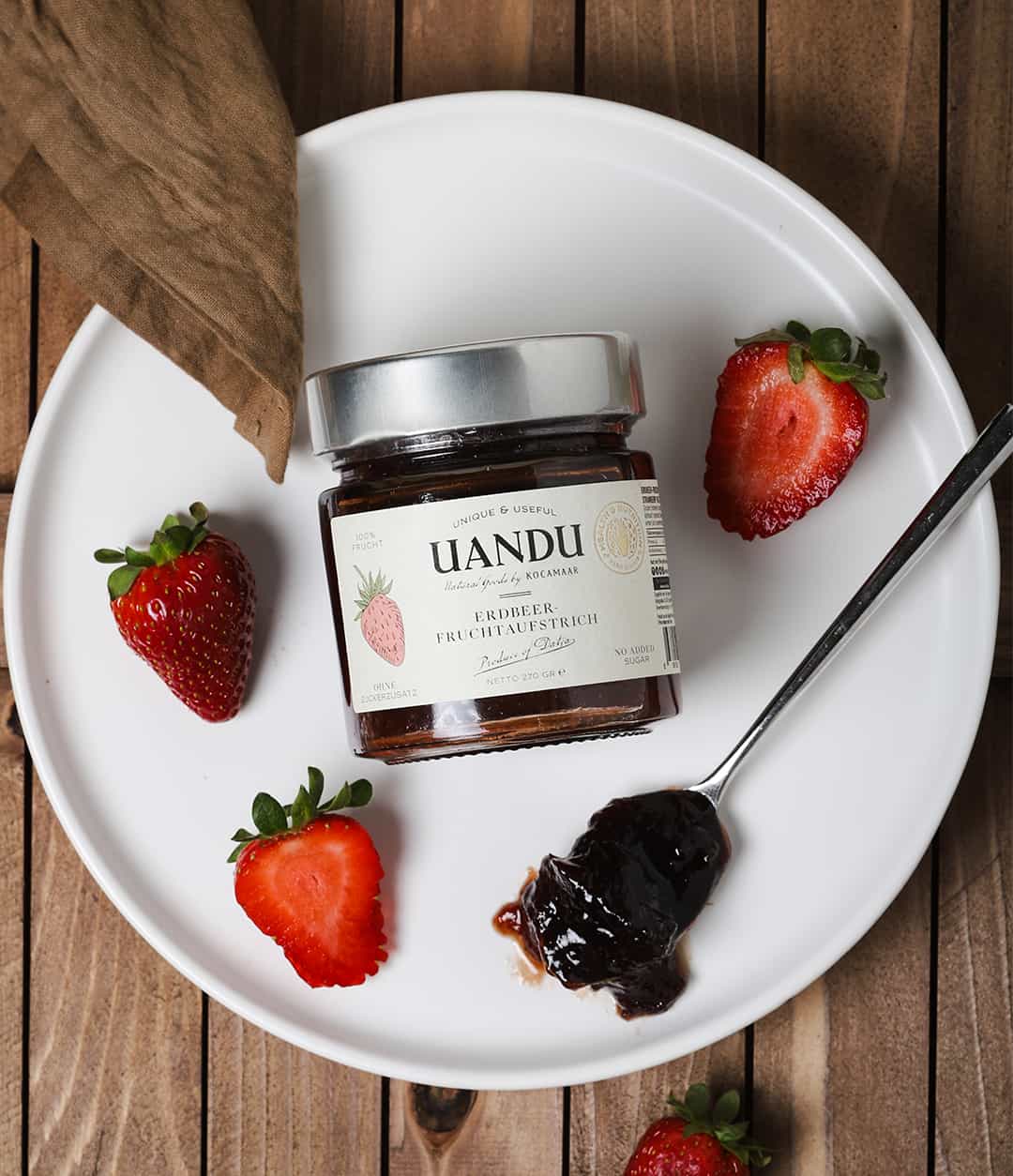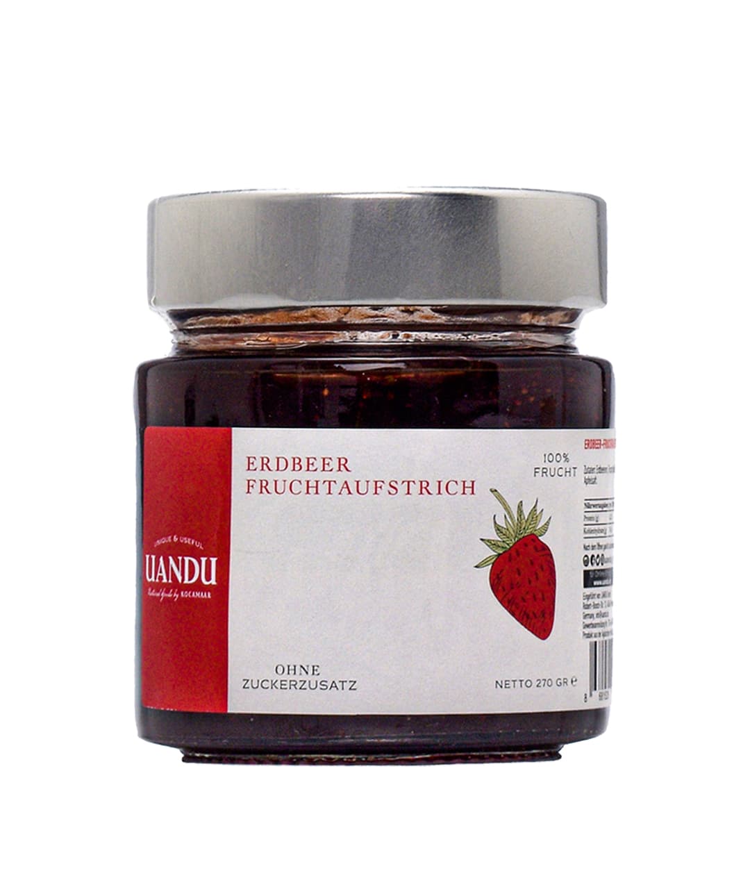 - In dem uandu Erdbeer-Fruchtaufstrich finden Sie die Natürlichkeit und den Geschmack von Erdbeeren, die mit Ihrem Geruch und Geschmack eine der besten Früchte sind. Erdbeermarmelade wird nach traditionellen Methoden aus frischen Früchten hergestellt, die mit guten landwirtschaftlichen Praktiken auf der Kocamaar Farm angebaut werden.