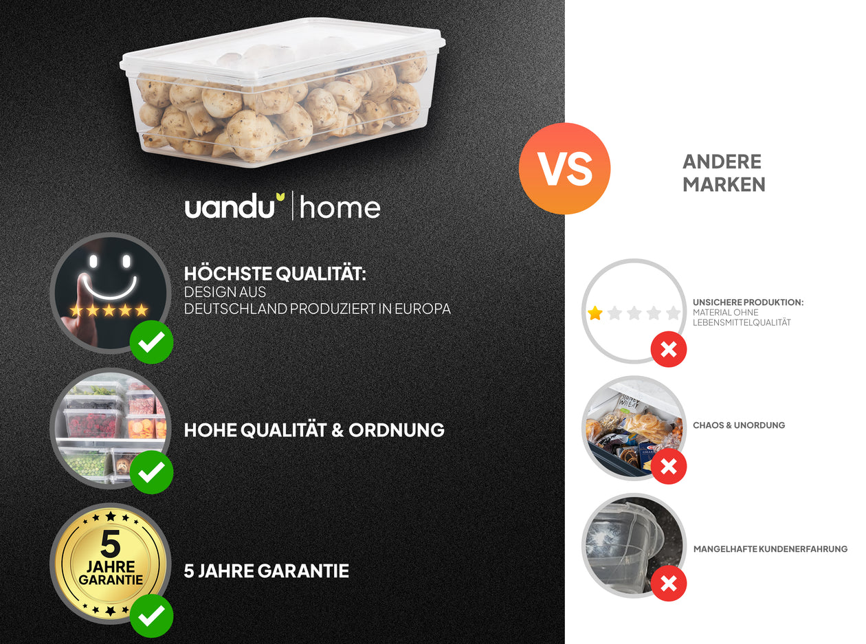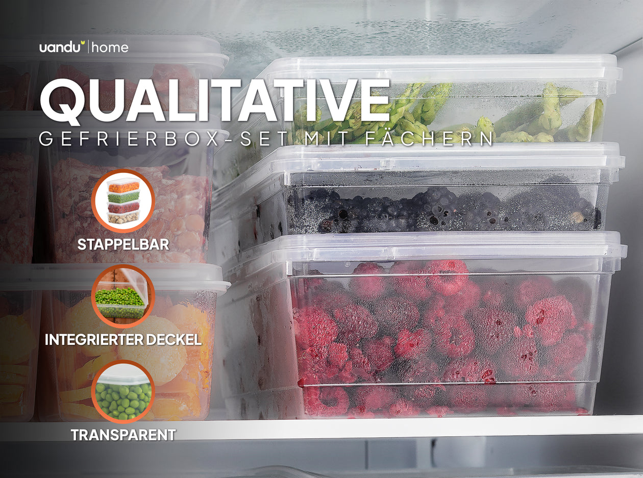Entdecken Sie unser vielseitiges Gefrierboxen-Set, ideal für die sichere Aufbewahrung und Frischhaltung Ihrer Lebensmittel. Dieses Set besteht aus hochwertigen Aufbewahrungsdosen mit Deckel, die speziell entwickelt wurden, um Ihre Vorräte frisch zu halten, egal ob im Kühlschrank oder im Gefrierschrank.