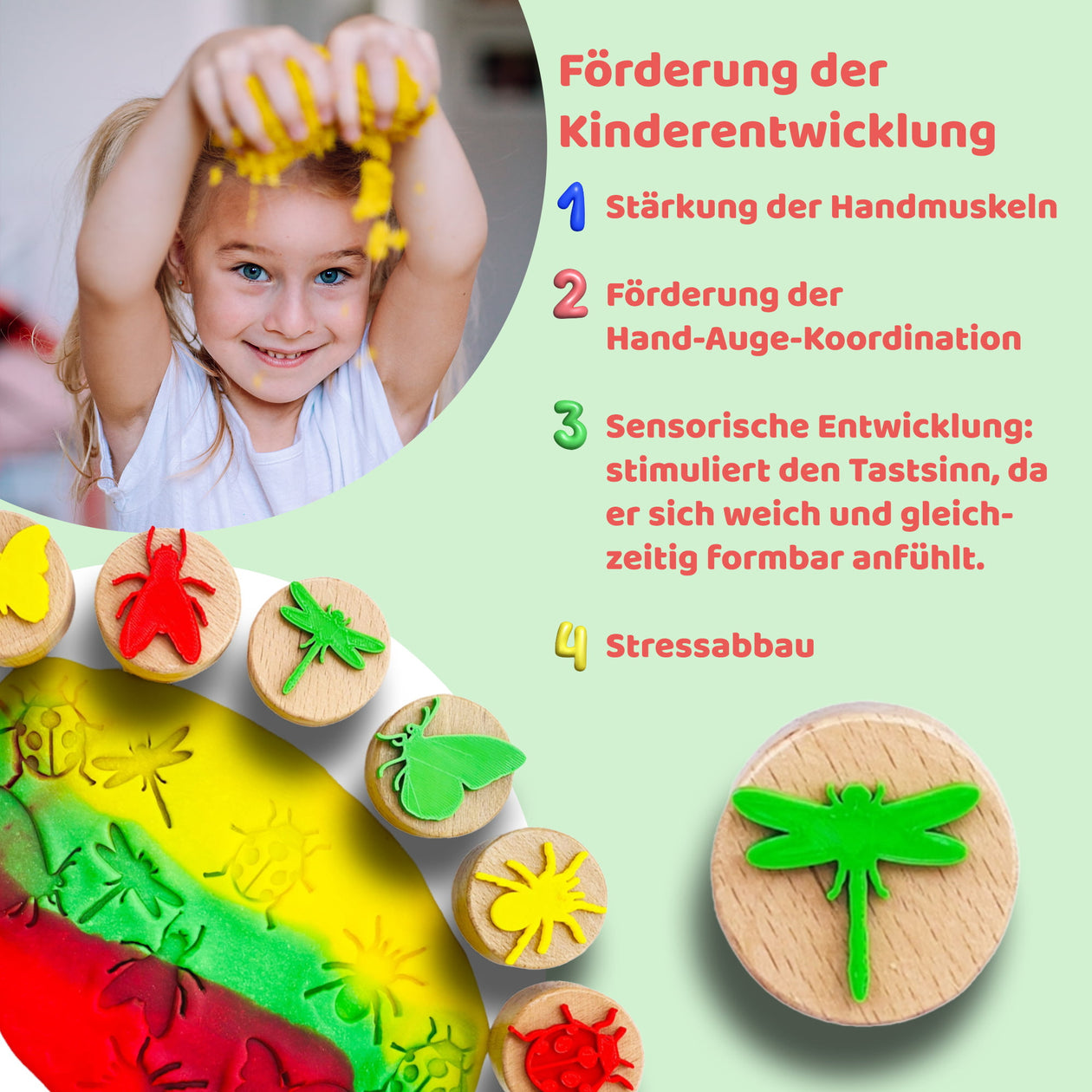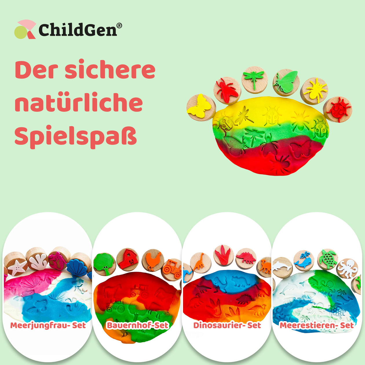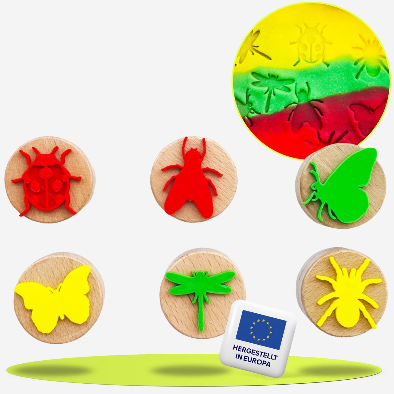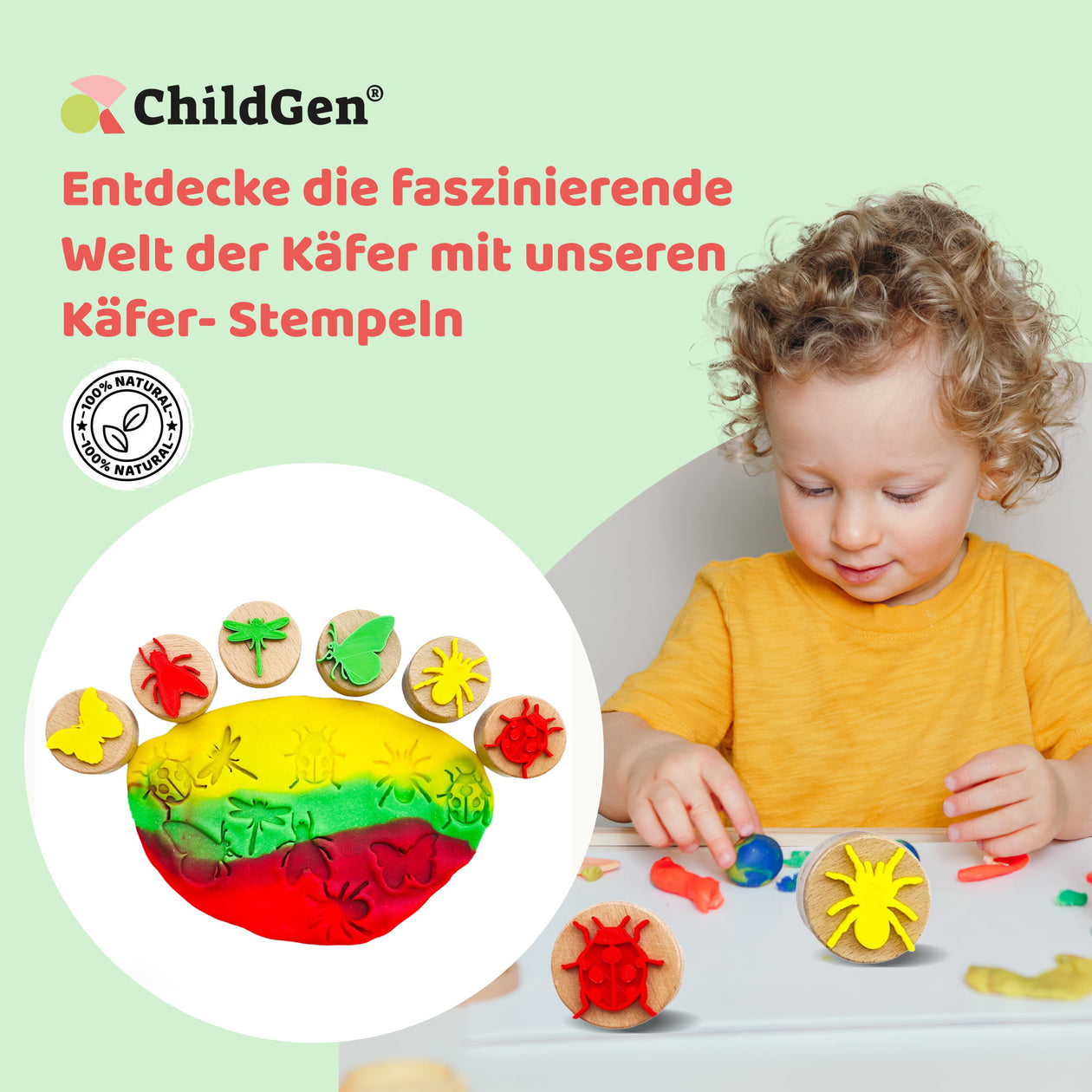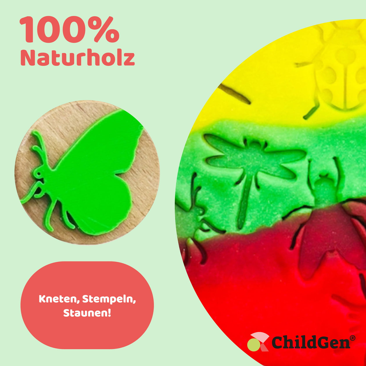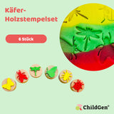 Die ChildGen Holzstempel Set mit 6 Stempeln im Käfer-Design für das Stempeln von Knete. Perfekt für kreative Knetprojekte und zur Förderung der Feinmotorik bei Kindern.