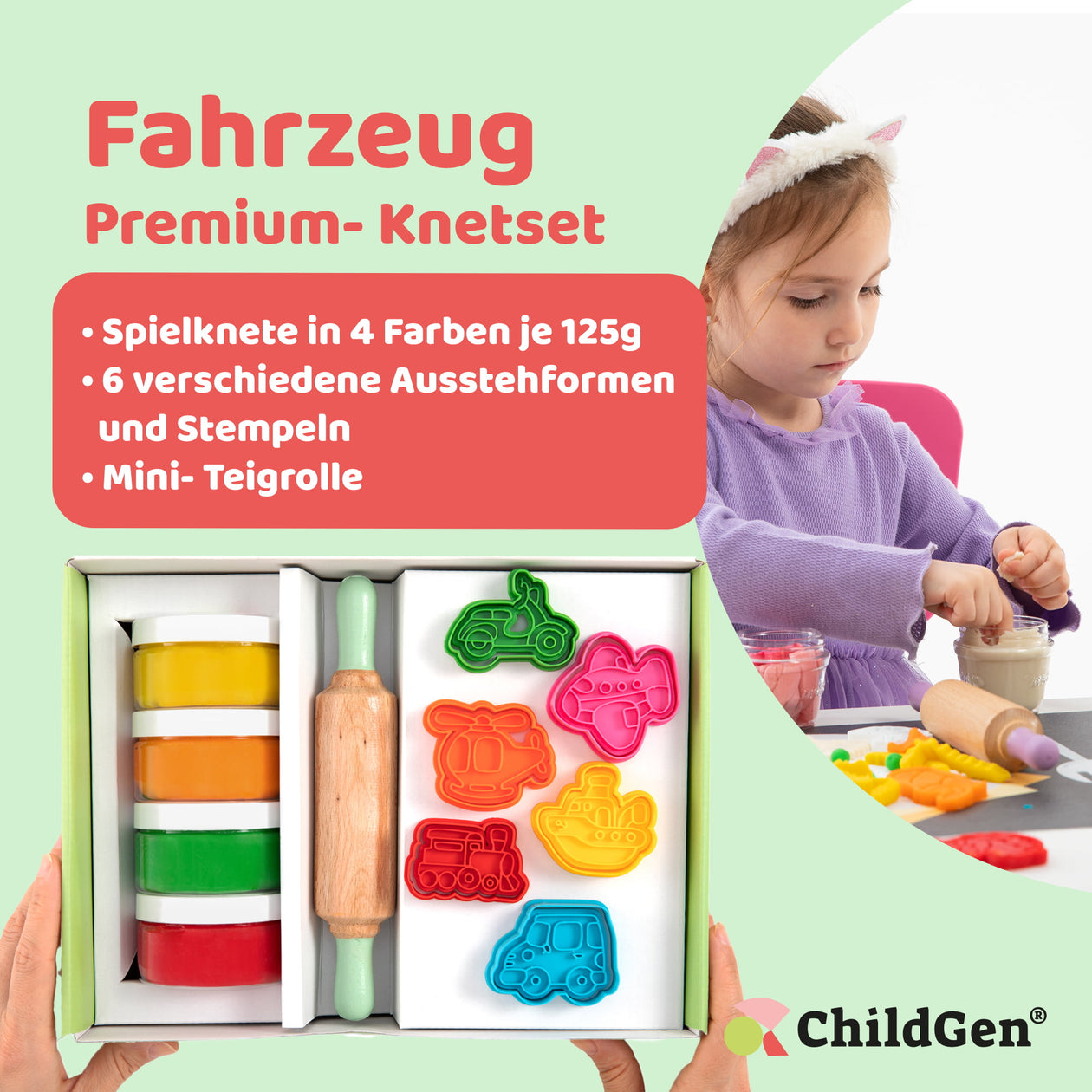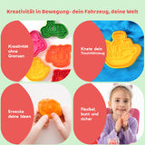Mit dem ChildGen Premium Knetset- Fahrzeuge können Kinder ihre eigene Fahrzeugwelt erschaffen! Das Set enthält 4 Dosen Knete in verschiedenen Farben, 6 Stempel, 6 Ausstechformen und eine Mini-Teigrolle, mit denen kleine Baumeister kreativ werden können. Kinder können Autos, Lastwagen, Flugzeuge und viele weitere Fahrzeuge aus Knete formen und stempeln. Dieses Set fördert die Fantasie, Feinmotorik und Hand-Augen-Koordination und sorgt gleichzeitig für stundenlangen Spielspaß. Wie alle ChildGen-Produkte ist auch dieses Set sicher, ungiftig und aus hochwertigen Materialien hergestellt.