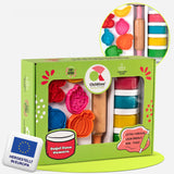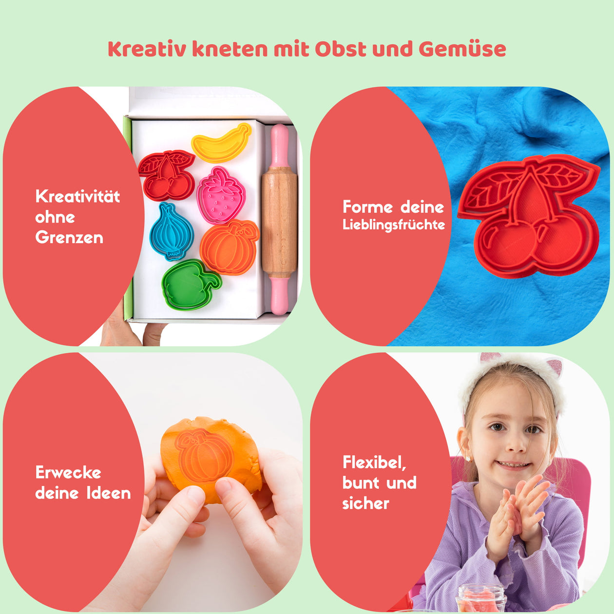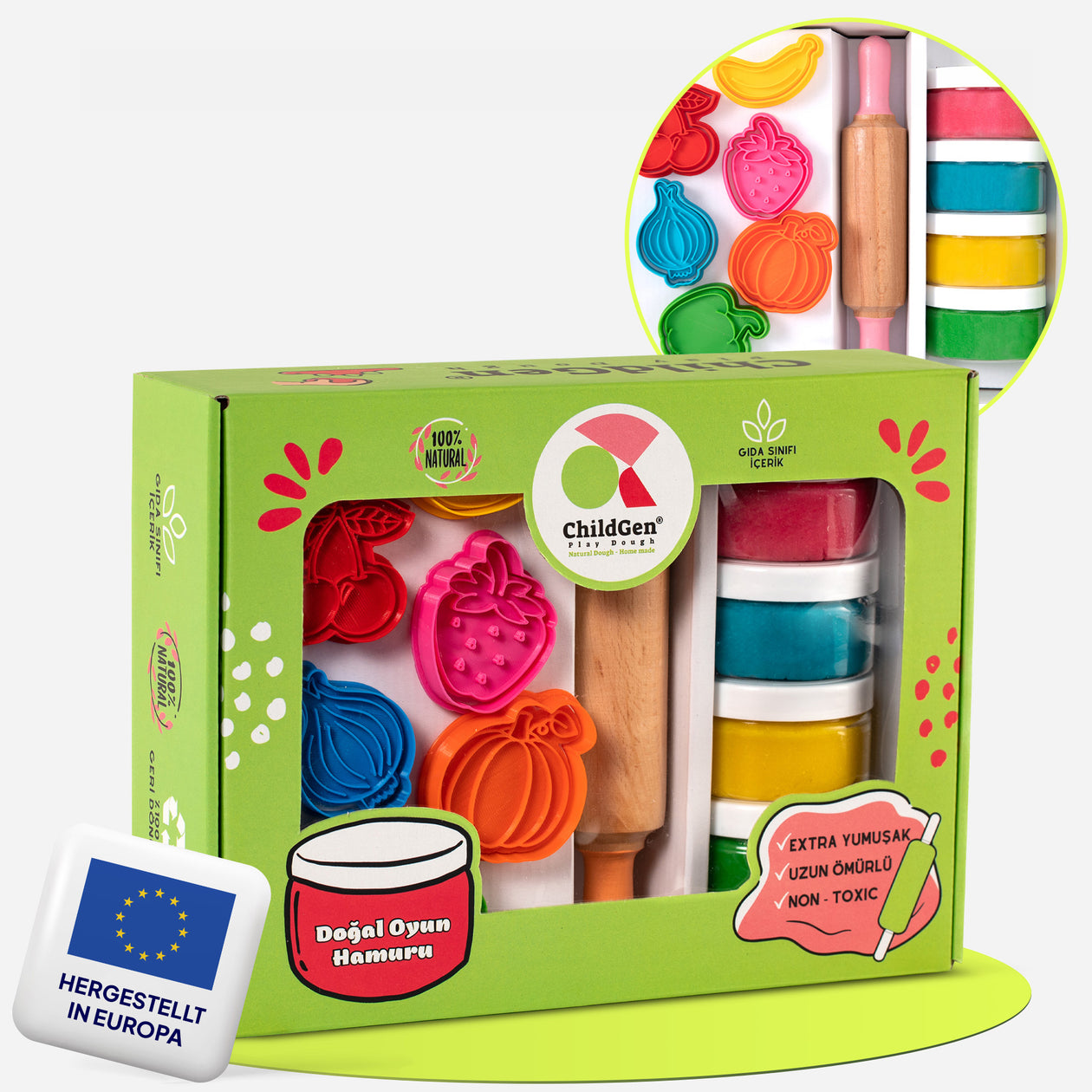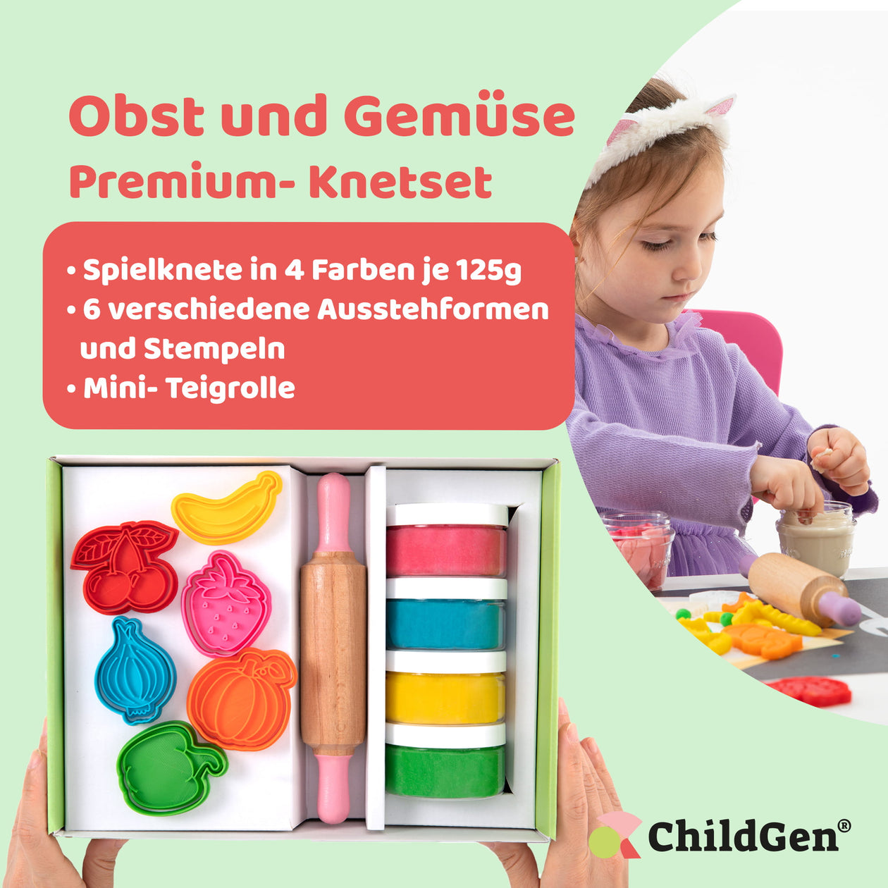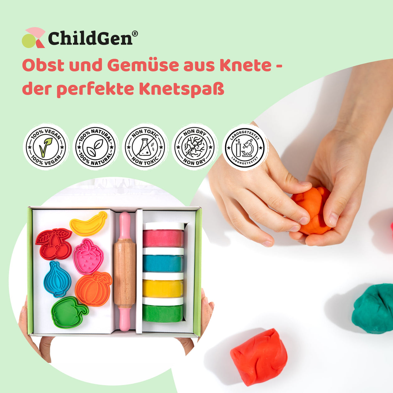 Das ChildGen Premium Knetset - Obst und Gemüse lässt Kinder eine bunte Welt aus gesunden Lebensmitteln gestalten! Mit 4 Dosen Knete, 6 Stempeln, 6 Ausstechformen und einer Mini-Teigrolle können Kinder Obst und Gemüse kreativ formen. Ideal, um Fantasie und Feinmotorik zu fördern und gleichzeitig mehr über gesunde Ernährung zu lernen. Sicher und ungiftig für sorgenfreies Spielen!
