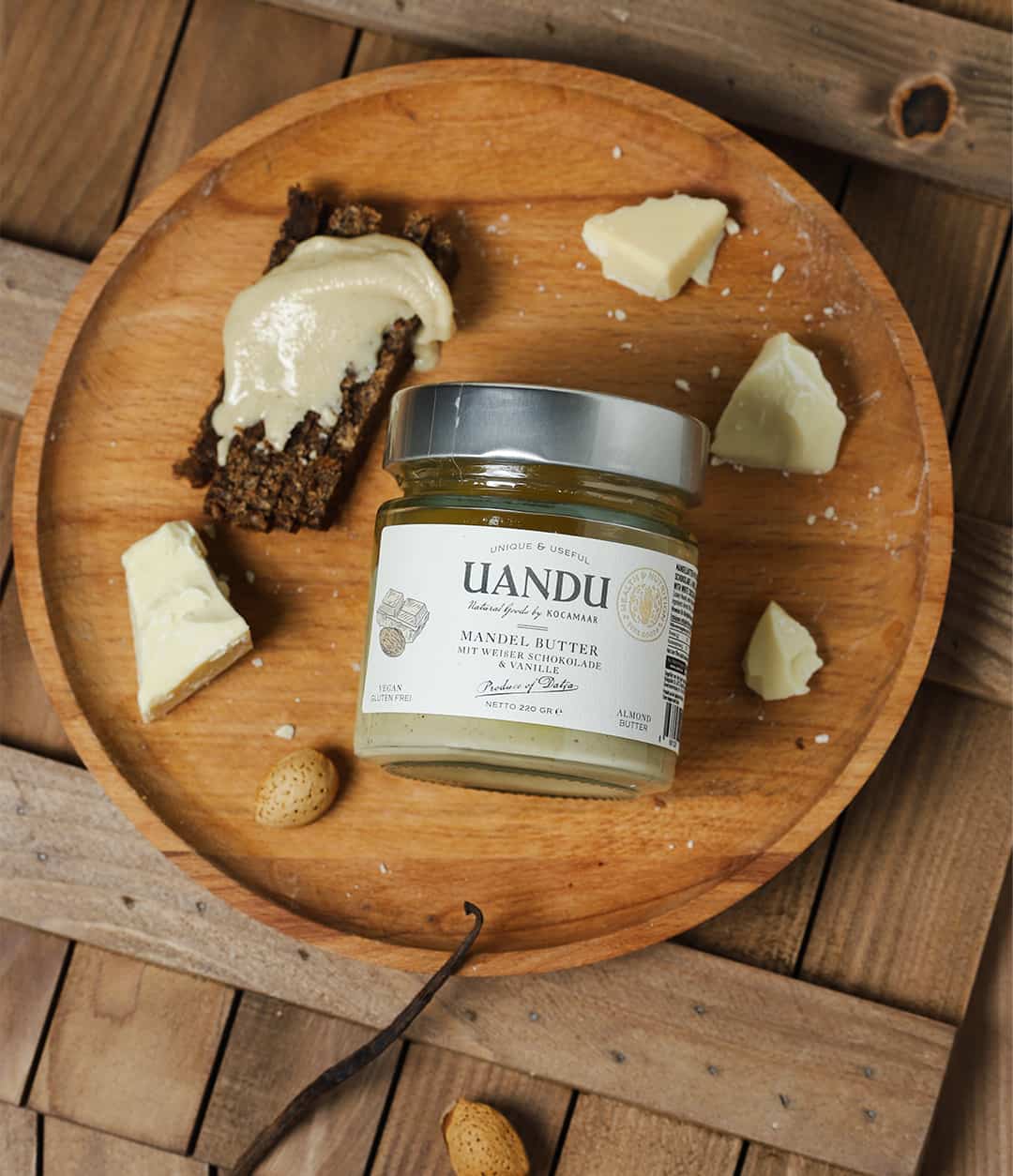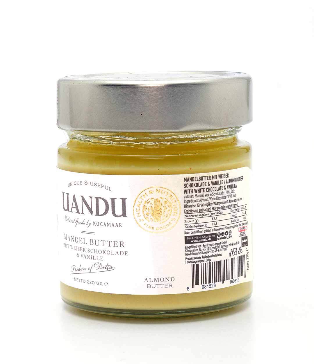 - uandus Weiße Schokolade und Vanille-Mandel-Butter, gewonnen aus Mandeln speziell aus Datca, ist die reinste und köstlichste Form von Mandeln. Es wird nach traditionellen Methoden aus Mandeln hergestellt, die auf dem Kocamaar Bauernhof mit guten landwirtschaftlichen Praktiken angebaut werden.