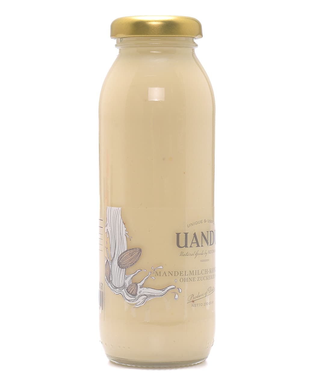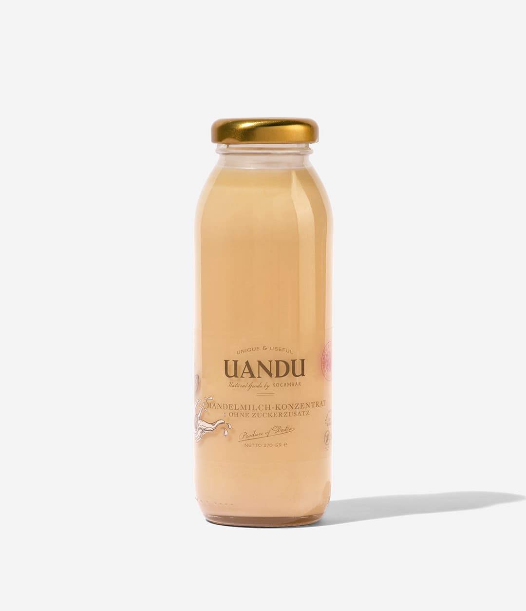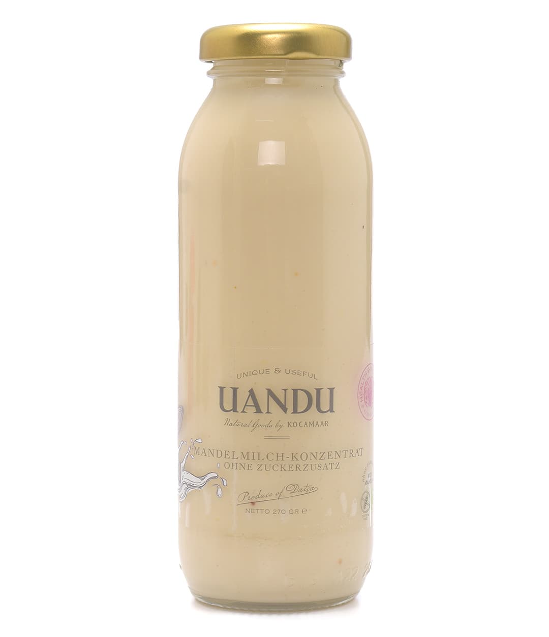 - Wenn man die Inhaltsstoffe anderer Mandelmilchproduzenten vergleicht, wird man schnell feststellen, dass der Nachteil fertiger Mandelmilch der hohe Zuckergehalt ist. Das Mandelmilch-Konzentrat UANDU VON KOCAMAAR ist ohne jeglichen Zuckerzusatz und ist ein reines Naturprodukt.