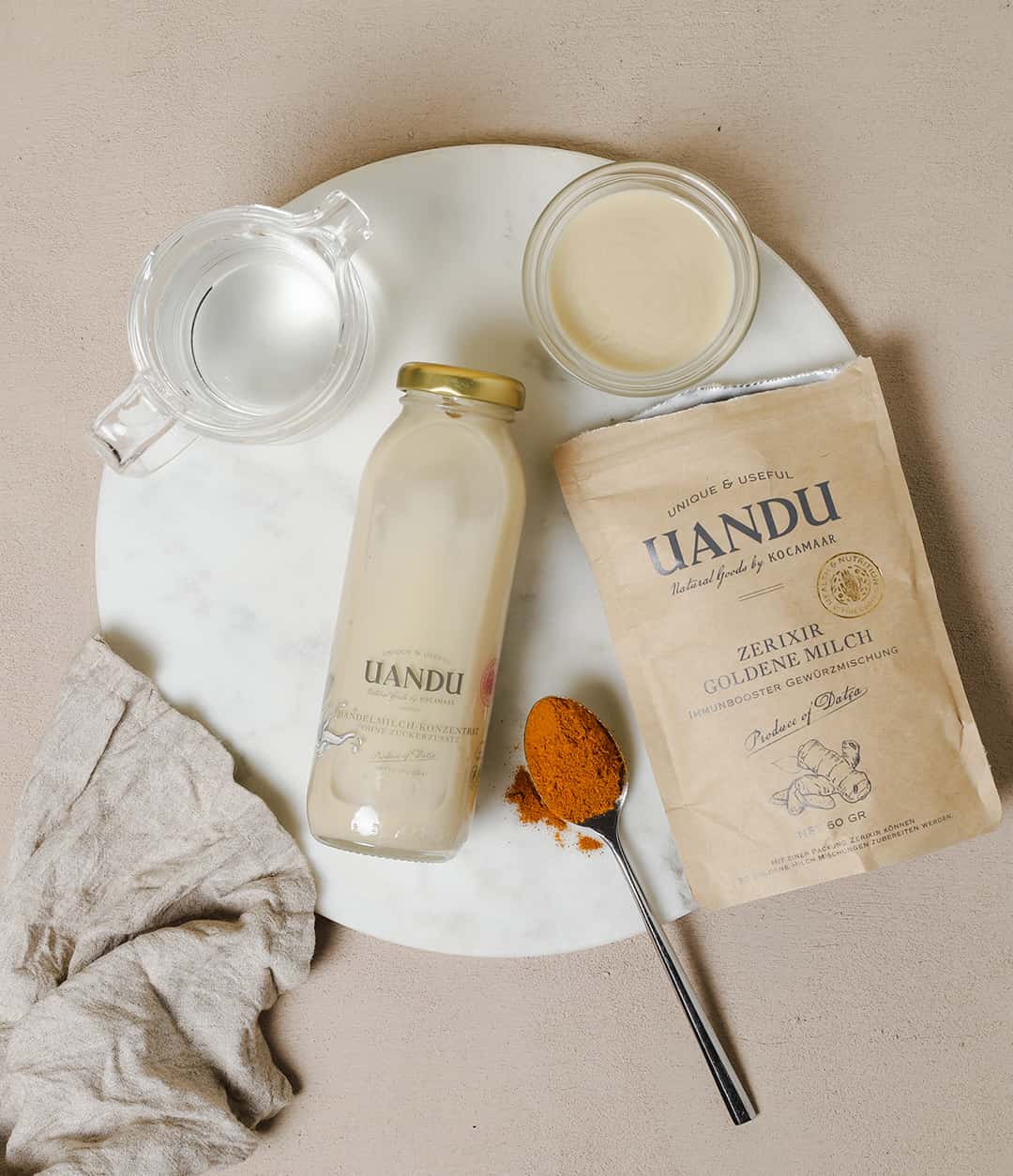 - Die konzentrierte Mandelmilch von UANDU enthält keine Zusatzstoffe, keinen Zucker oder Konservierungsstoffe. Sie ist aus 100% pflanzlichen Inhaltsstoffen hergestellt und ein absolutes innovatives Produkt.