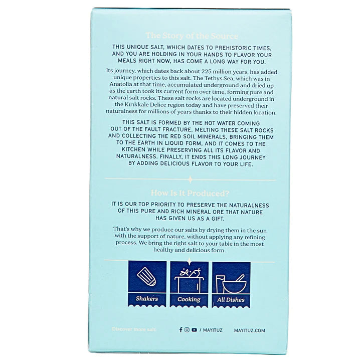 - Unser grobkörniges körniges Quellsalz wird aus 100% natürlichem Quellwassersalz in gewächshausähnlichen Becken ohne Raffination hergestellt.