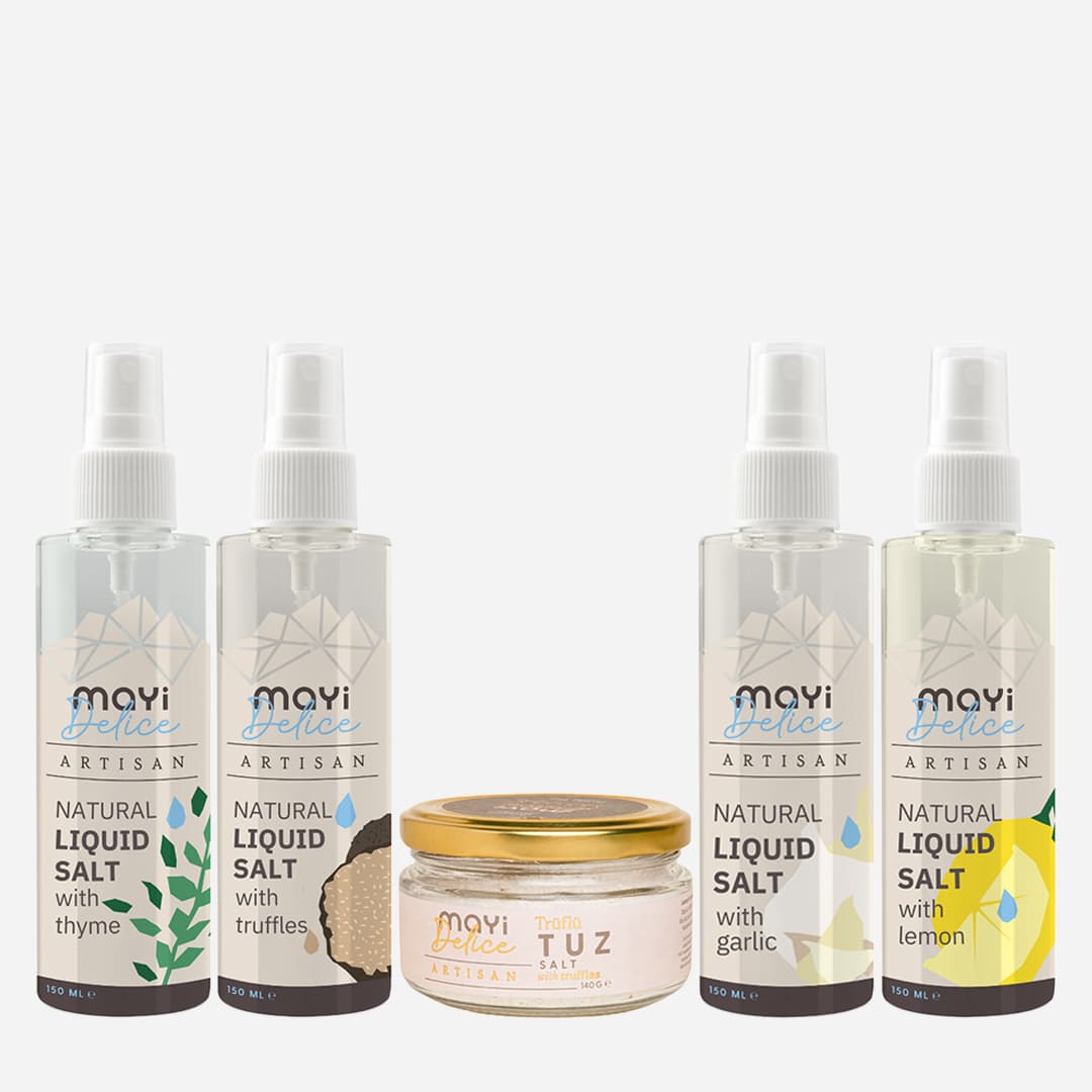 - Mayi Trüffelsalz: Fein gemahlenes Salz mit einem Hauch von Trüffel, das eine elegante Würze für Pasta, Salate und gegrilltes Gemüse bietet.