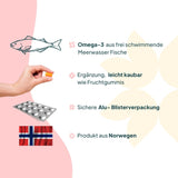 Zutaten: Fischölkonzentrat (31,7%), Süßungsmittel Xylit, Wasser, Süßungsmittel Sorbit, Geliermittel