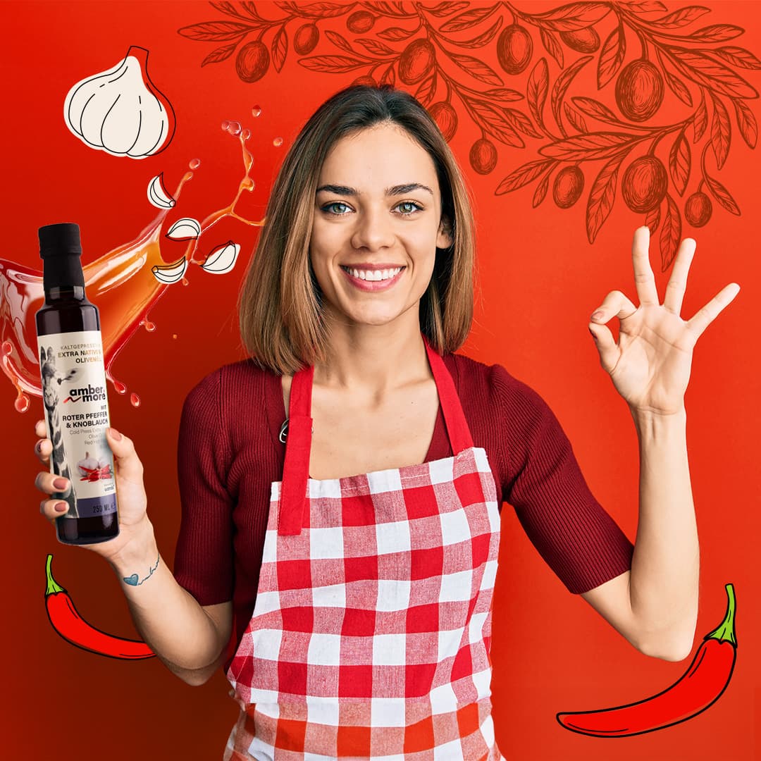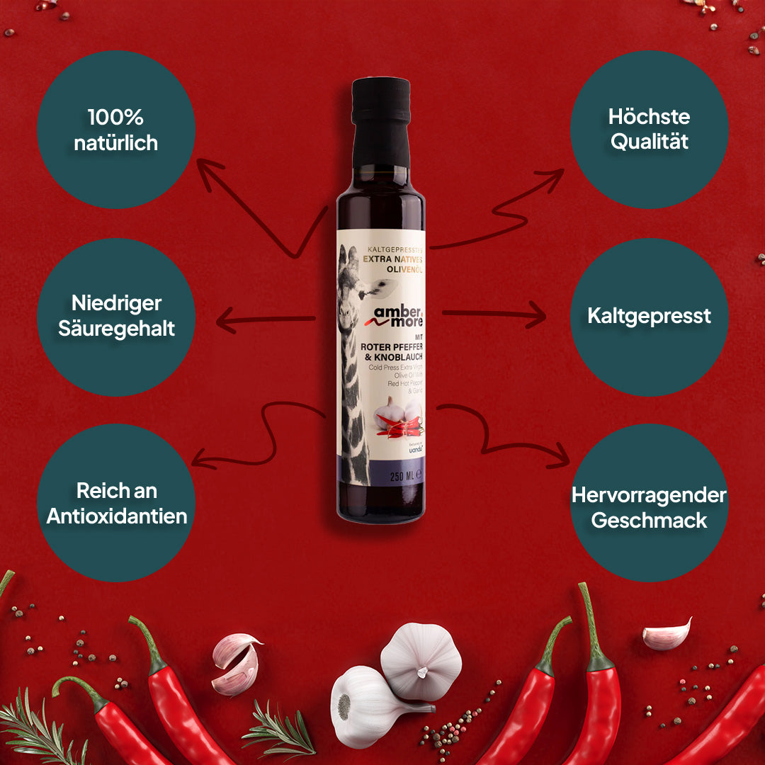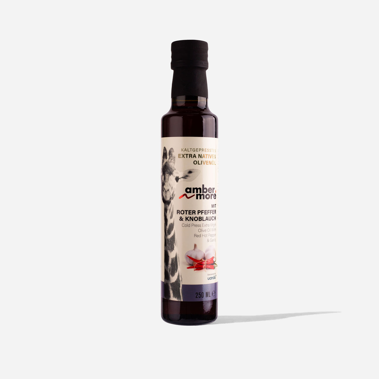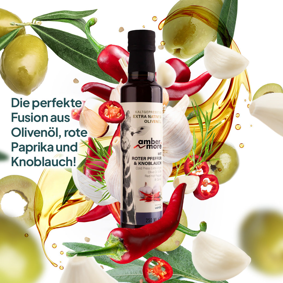 Extra natives Olivenöl mit rotem Pfeffer und Knoblauch ist eine delikate Variation von Olivenöl, die mit der Würze von rotem Pfeffer und der aromatischen Kraft von Knoblauch verfeinert wird. Diese Kombination ergibt ein intensives und vielseitiges Öl, das perfekt für Liebhaber von würzigen Geschmacksrichtungen ist. Das Olivenöl mit rotem Pfeffer und Knoblauch eignet sich ideal zum Marinieren von Fleisch und Gemüse, zum Verfeinern von Saucen und Dressings sowie zum Anbraten von Speisen. Es verleiht den Gerichten eine angenehme Schärfe und eine feine Knoblauchnote, die für eine aromatische Geschmacksexplosion sorgt. Dieses Produkt ist eine Bereicherung für die mediterrane Küche und bringt Abwechslung und Geschmack in Ihre Gerichte.