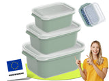 - Behälter aus hitzebeständigem Borosilikatglas – geeignet für Backofen (ohne Deckel), Mikrowelle (ohne Deckel), Kühlschrank und Gefrierfach.