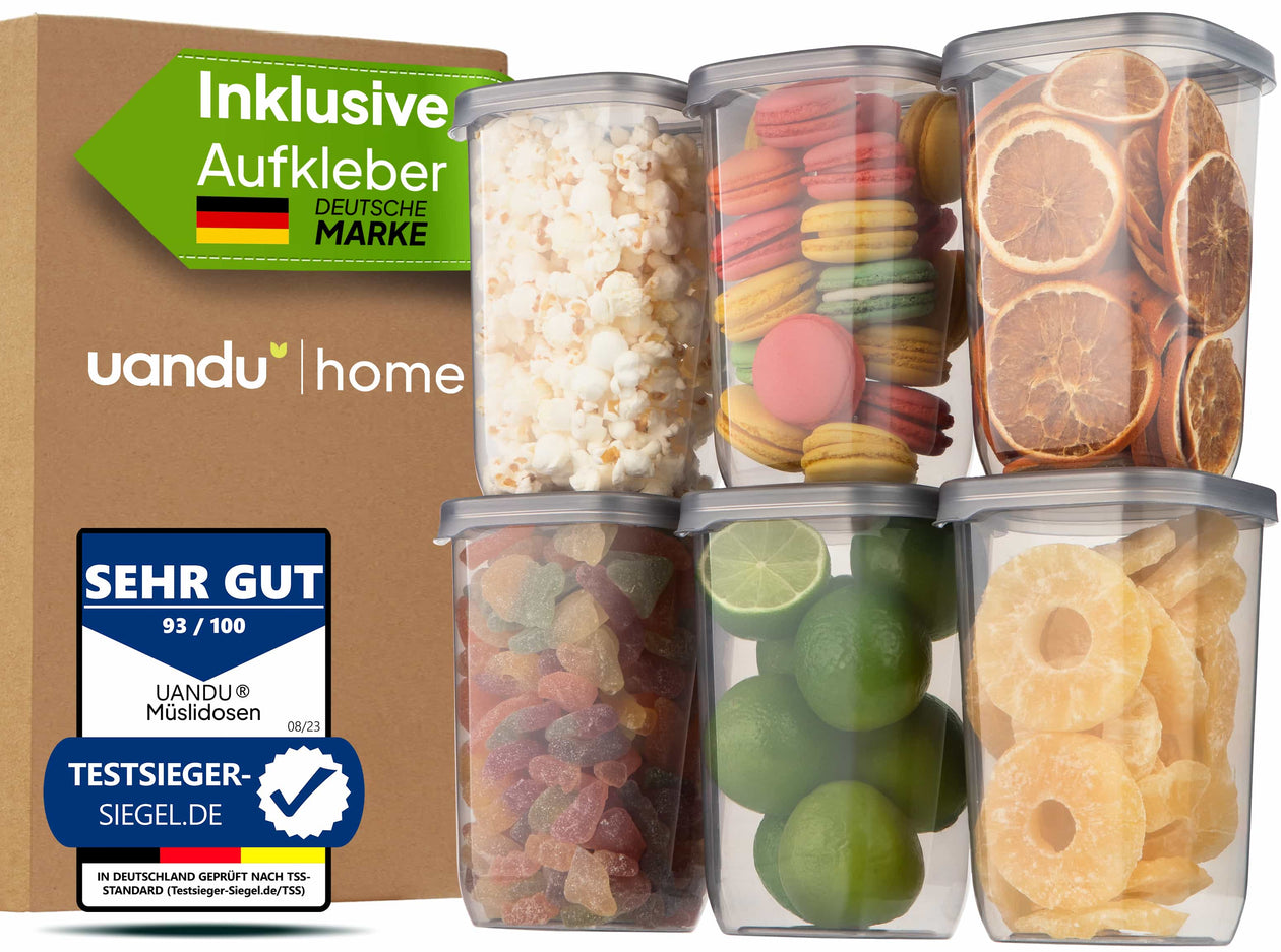 - UYGUN SAKLAMA BOYUTU Bu ürün Saklama Kavanozu Mutfak Seti 6x1200ml (11x11x16.5cm) Toplam 6 Saklama Kavanozu + Ekstra 25 Etiket içerir. saklama kutusu mutfak. UANDU saklama kutularının kapları bulaşık makinesinde yıkanabilir.
