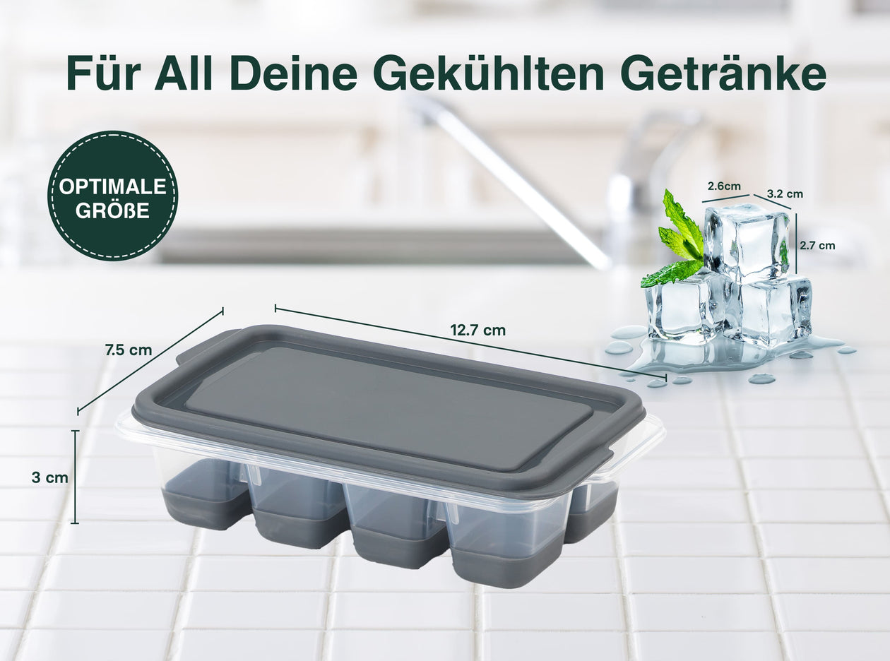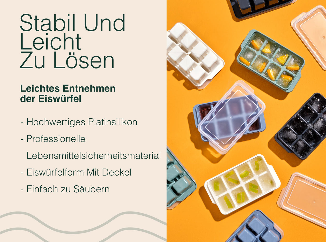 - HOHE LEBENSMITTELQUALITÄT: Diese Silikon-Eiswürfelform ist das perfekte Behälter, um Ihre Getränke zu kühlen oder leckere gefrorene Snacks zuzubereiten. Das Eiswürfelform aus Silikon mit Deckel in Lebensmittelqualität ist eine praktische und sichere Lösung für die Herstellung von Eiswürfeln und anderen gefrorenen Leckereien. Hergestellt aus hochwertigem, lebensmittelechtem Silikon, das frei von schädlichen Chemikalien ist, um die Sicherheit Ihrer Lebensmittel zu gewährleisten.