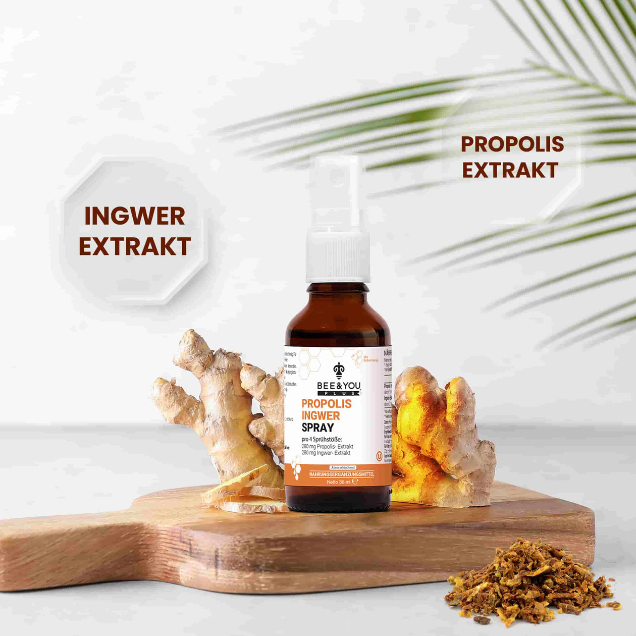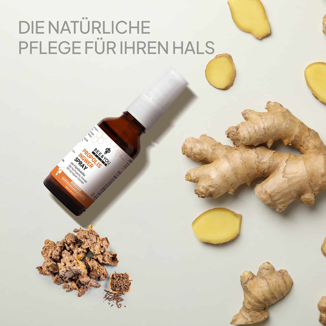 Propolis Ingwer Spray: Zutat auf natürlicher Basis. Nahrungsergänzungsmittel mit Gingerolen und Polyphenolen.