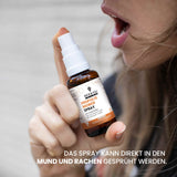 2. Den Sprühkopf direkt auf den Rachen richten und den Sprühmechanismus betätigen, um das Propolis Mundspray zu verwenden. Ziel ist es, das Mundspray gezielt im Rachenbereich zu platzieren.