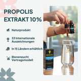 Der Propolis Extrakt 10% bietet eine bequeme Möglichkeit, Vorteile von Propolis zu nutzen. Dieser Propolis Tinktur ist leicht in Flüssigkeiten mischbar und ermöglicht eine vielseitige Anwendung. Außerdem enthalten Propolis Tropfen wertvolle Antioxidantien aus Propolis. Die 10%ige Konzentration der Propolis Tropfen ist ideal als Nahrungsergänzungsmittel, in Getränken bis hin zu kosmetischen Produkten.