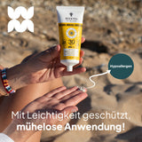 Tragen Sie die Sonnencreme großzügig auf die Haut auf, bevor Sie sich der Sonne aussetzen. Wiederholen Sie diesen Vorgang nach dem Schwimmen im Meer oder im Pool, da das Wasser die Wirkung der Sonnencreme verringern kann. Bei intensiver Sonneneinstrahlung wird empfohlen, die Sonnencreme alle Stunden erneut aufzutragen, um einen effektiven Schutz aufrechtzuerhalten. Bitte beachten Sie, dass die Sonnencreme nur zur äußerlichen Anwendung bestimmt ist.